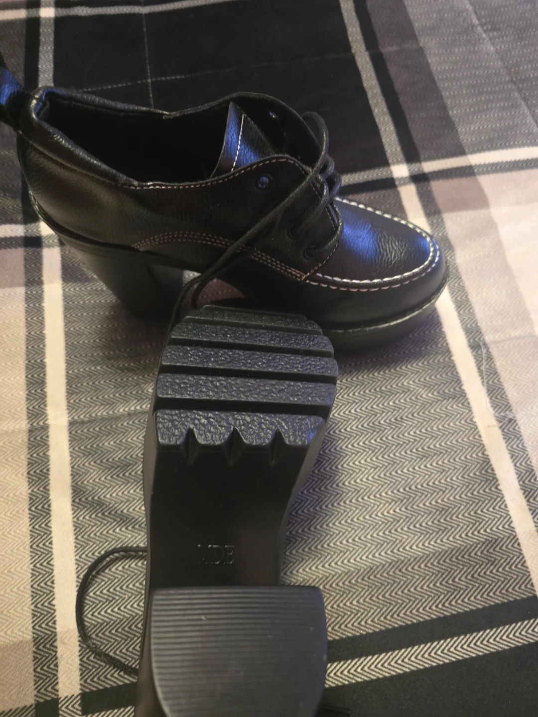 Black faux leather platform heeled shoes with white contrast stitching. Features a lace-up closure and a thick lug sole. Heel height approximately 4 inches.