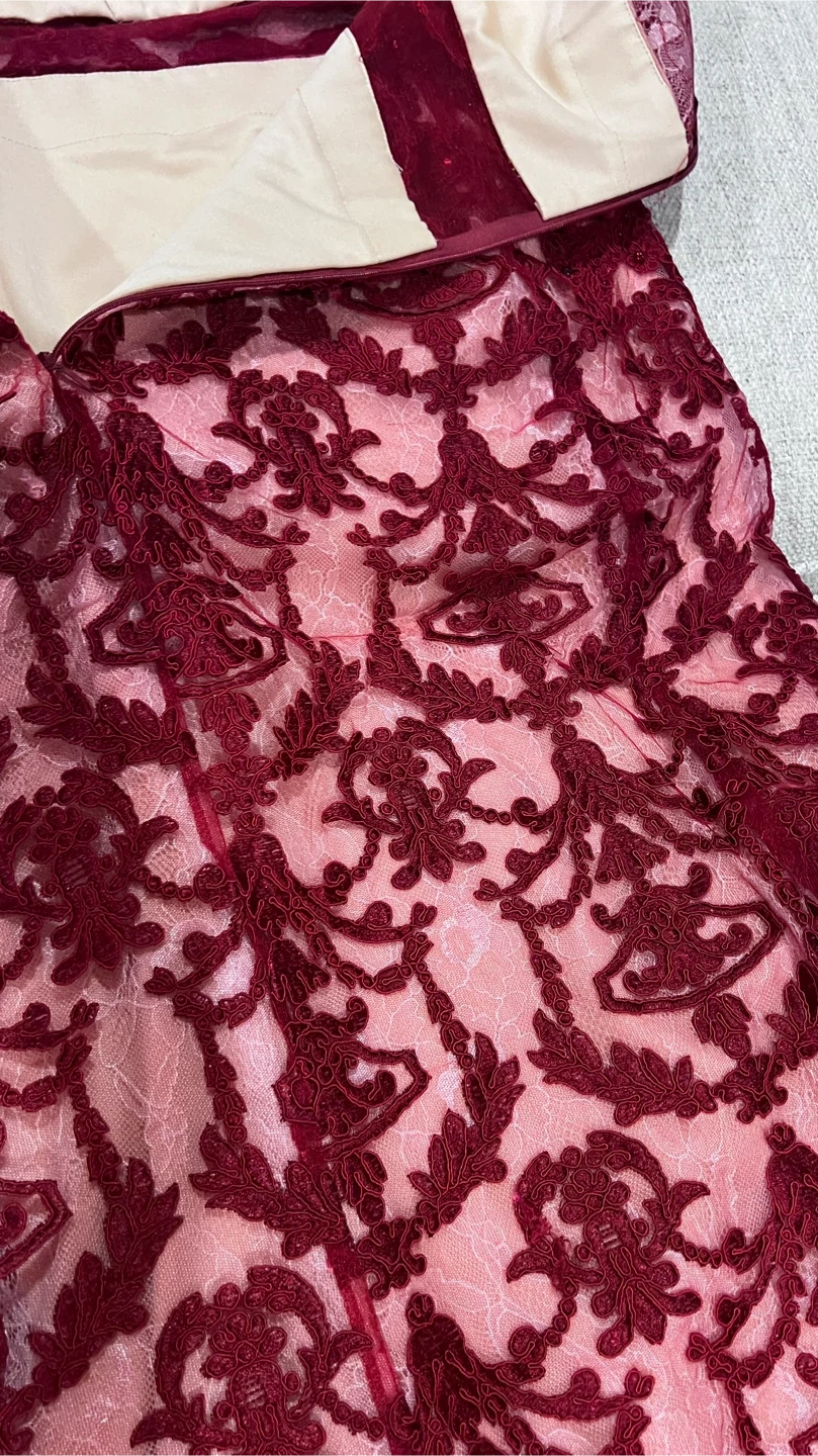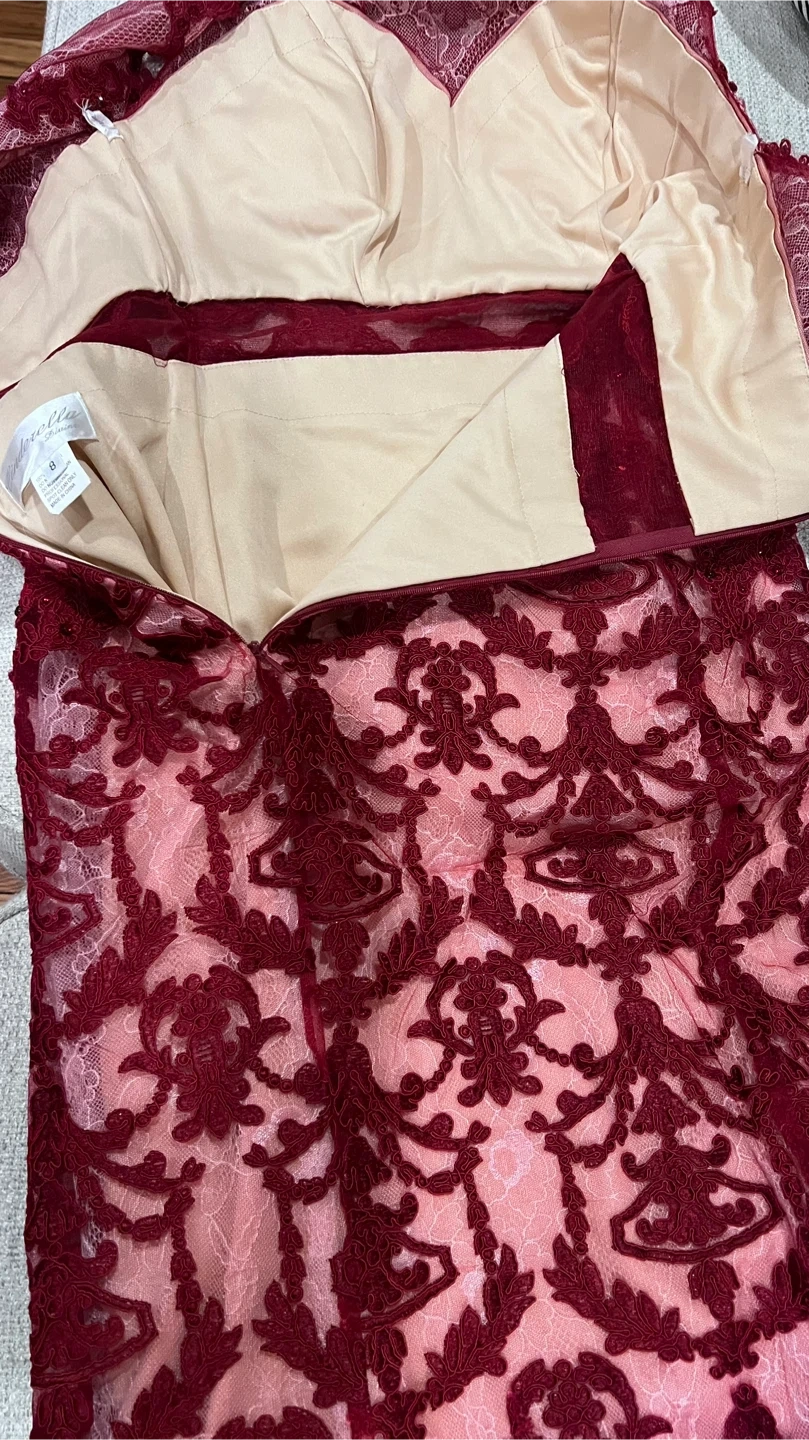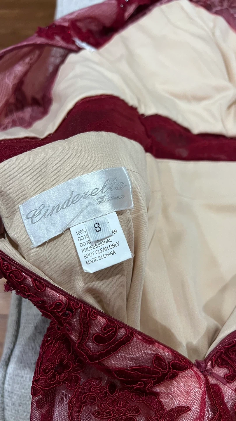 Selling a beautiful Cinderella Divine formal dress in size 8. It features a stunning maroon lace overlay and a flattering silhouette. Perfect for a special occasion!