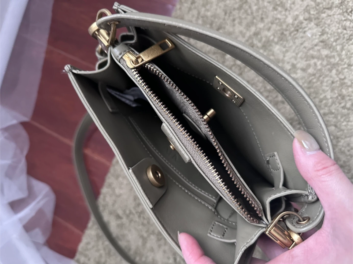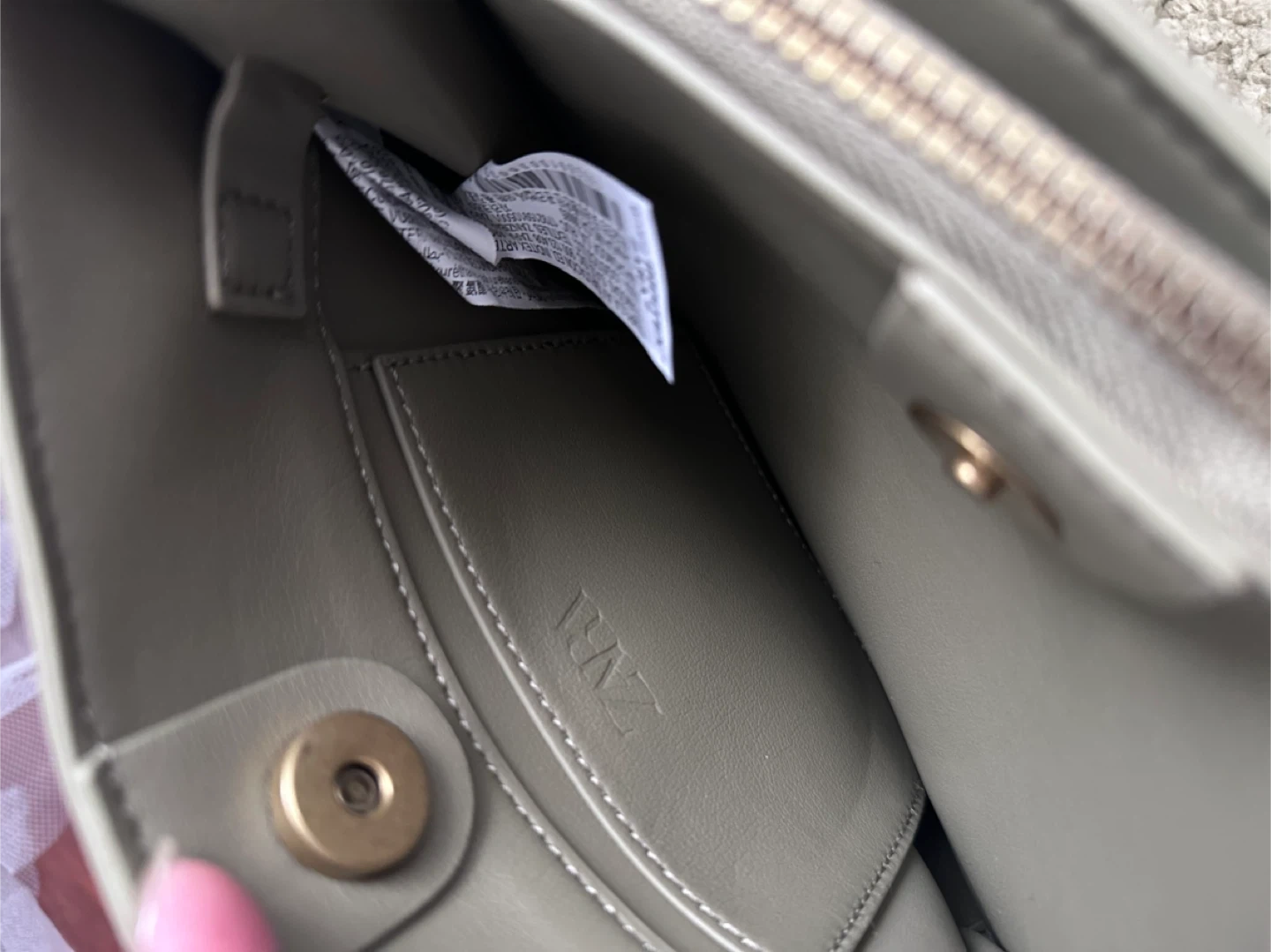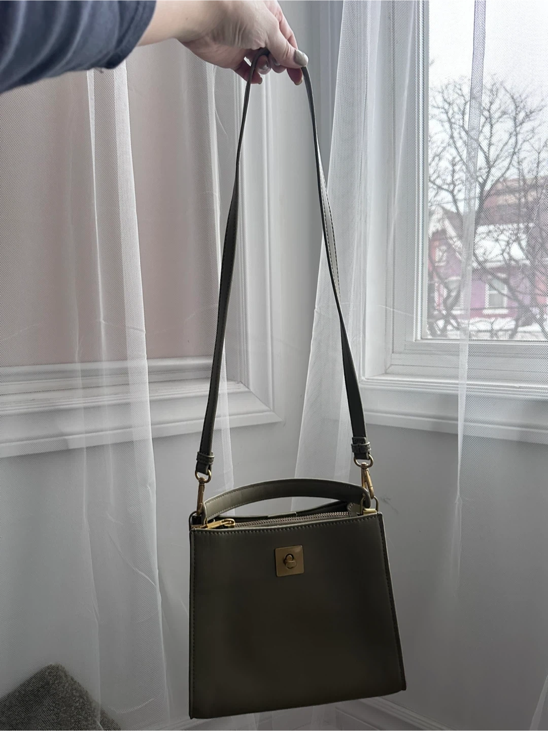 This is a Zara top handle bag in a light green colour. It's a structured bag with a zip closure and an internal pocket. It includes a detachable shoulder strap.