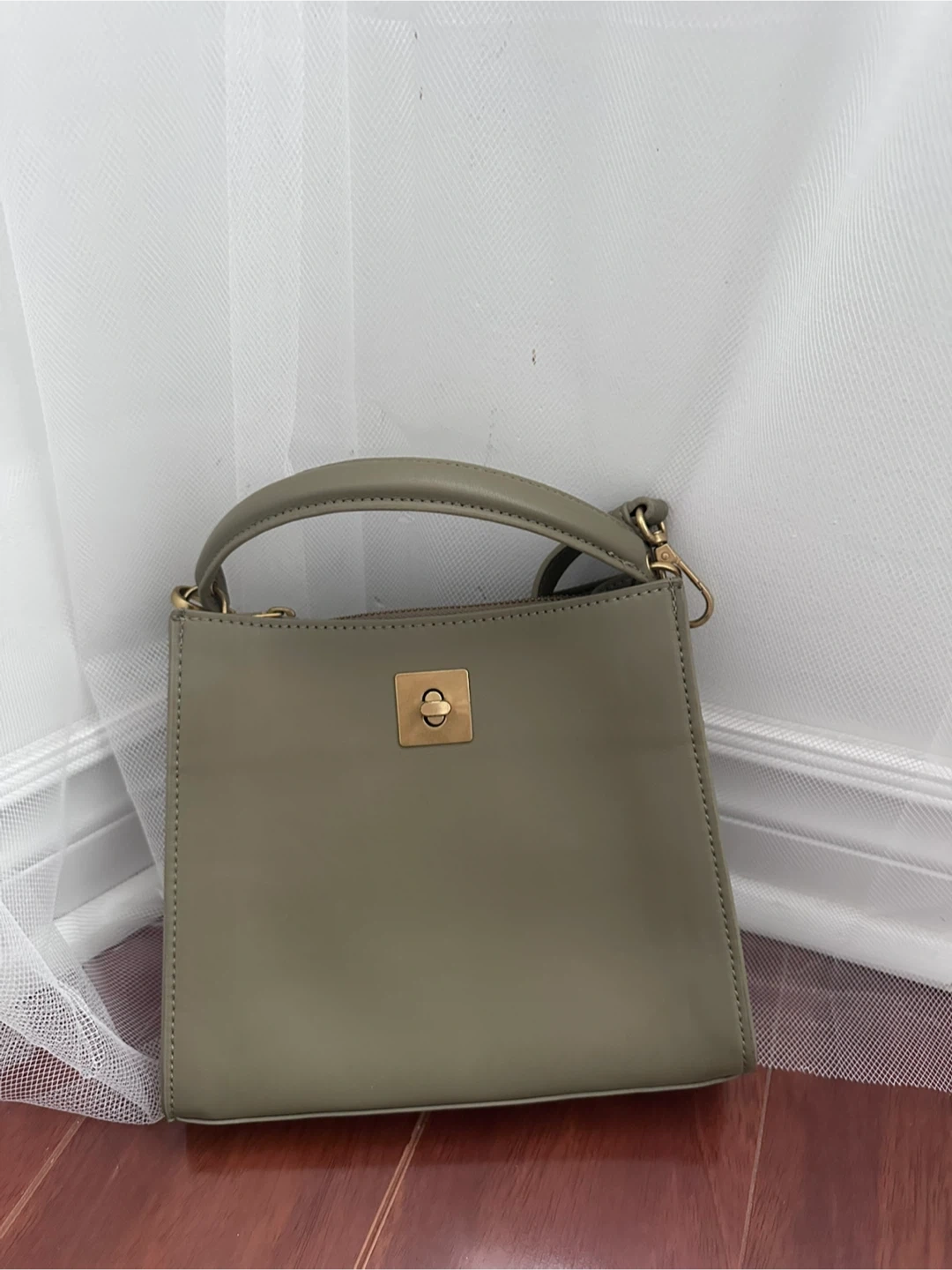 This is a Zara top handle bag in a light green colour. It's a structured bag with a zip closure and an internal pocket. It includes a detachable shoulder strap.