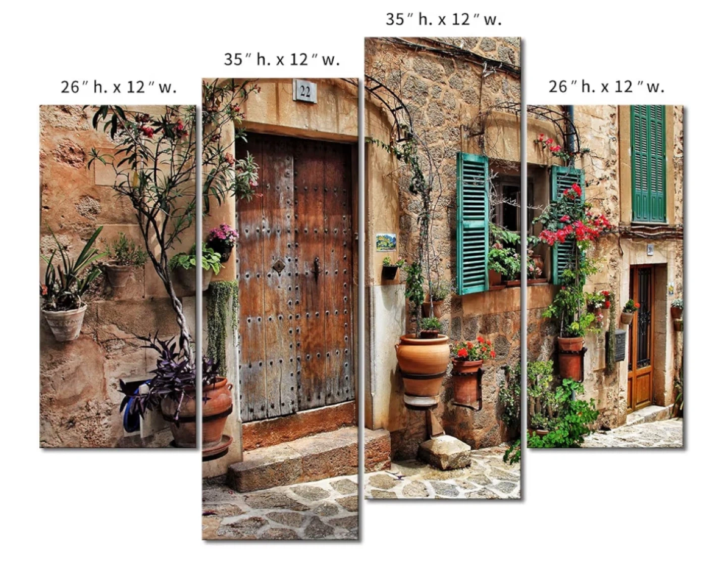 For sale NEW Four-piece canvas set depicting a charming Mediterranean courtyard. It features a rustic wooden door and lush potted plants. These pieces are wrapped in plastic for protection.