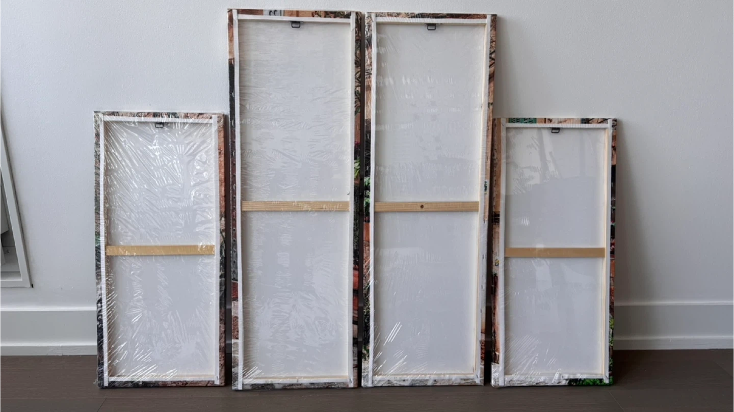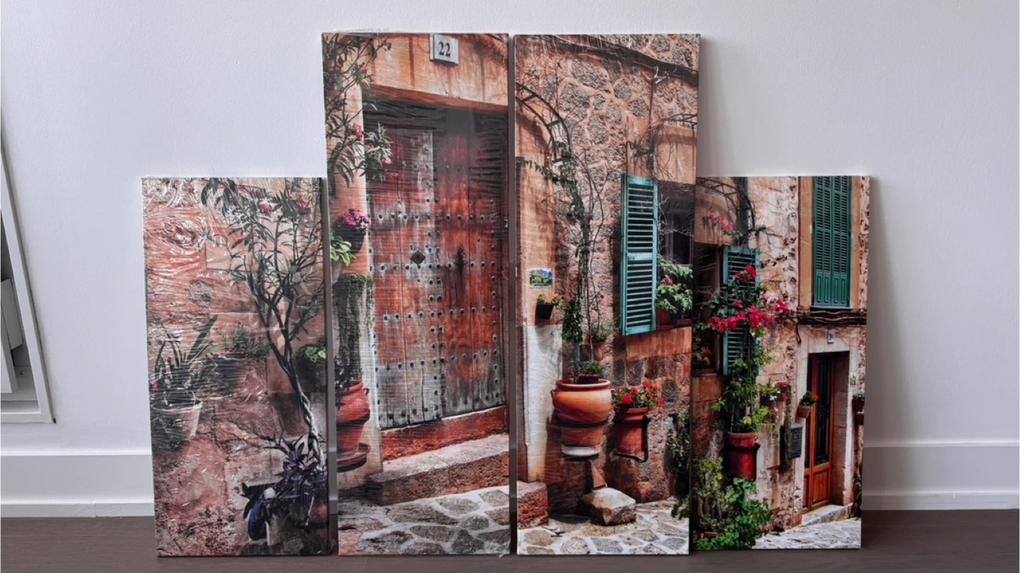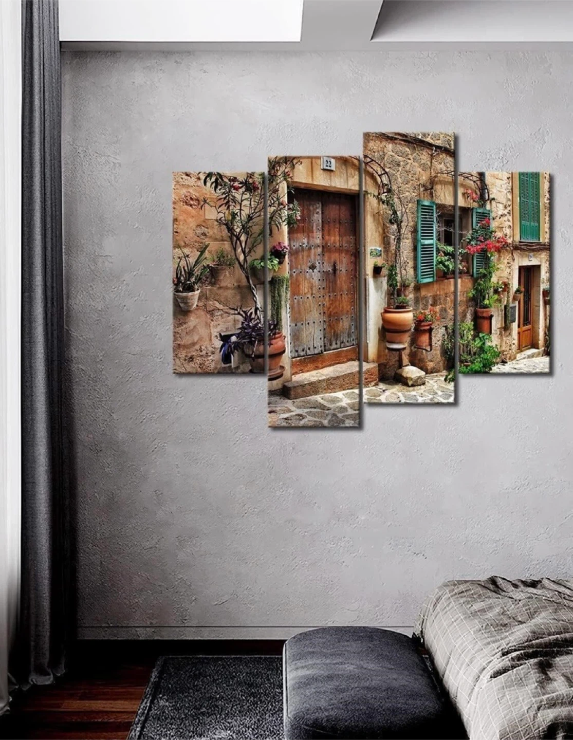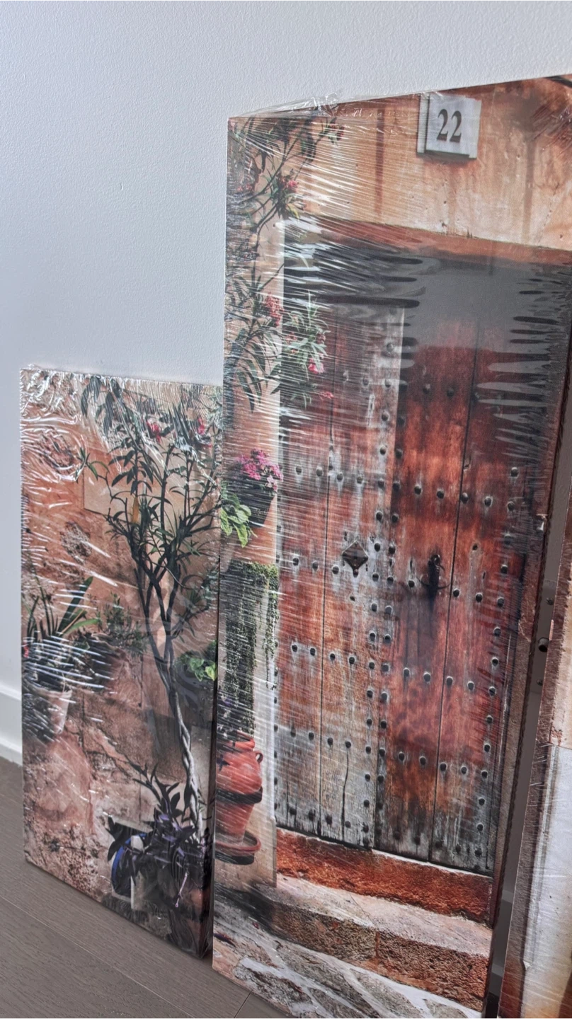 For sale NEW Four-piece canvas set depicting a charming Mediterranean courtyard. It features a rustic wooden door and lush potted plants. These pieces are wrapped in plastic for protection.
