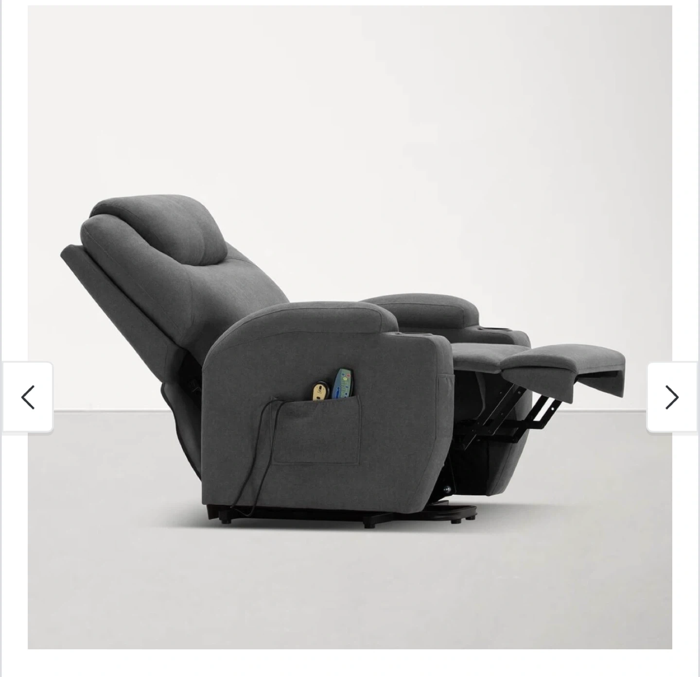 This is a grey fabric electric power lift recliner chair. It features a cup holder and a side pocket for storage. Perfect for relaxing after a long day!