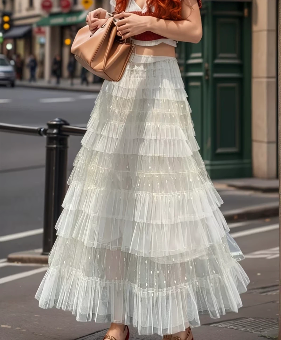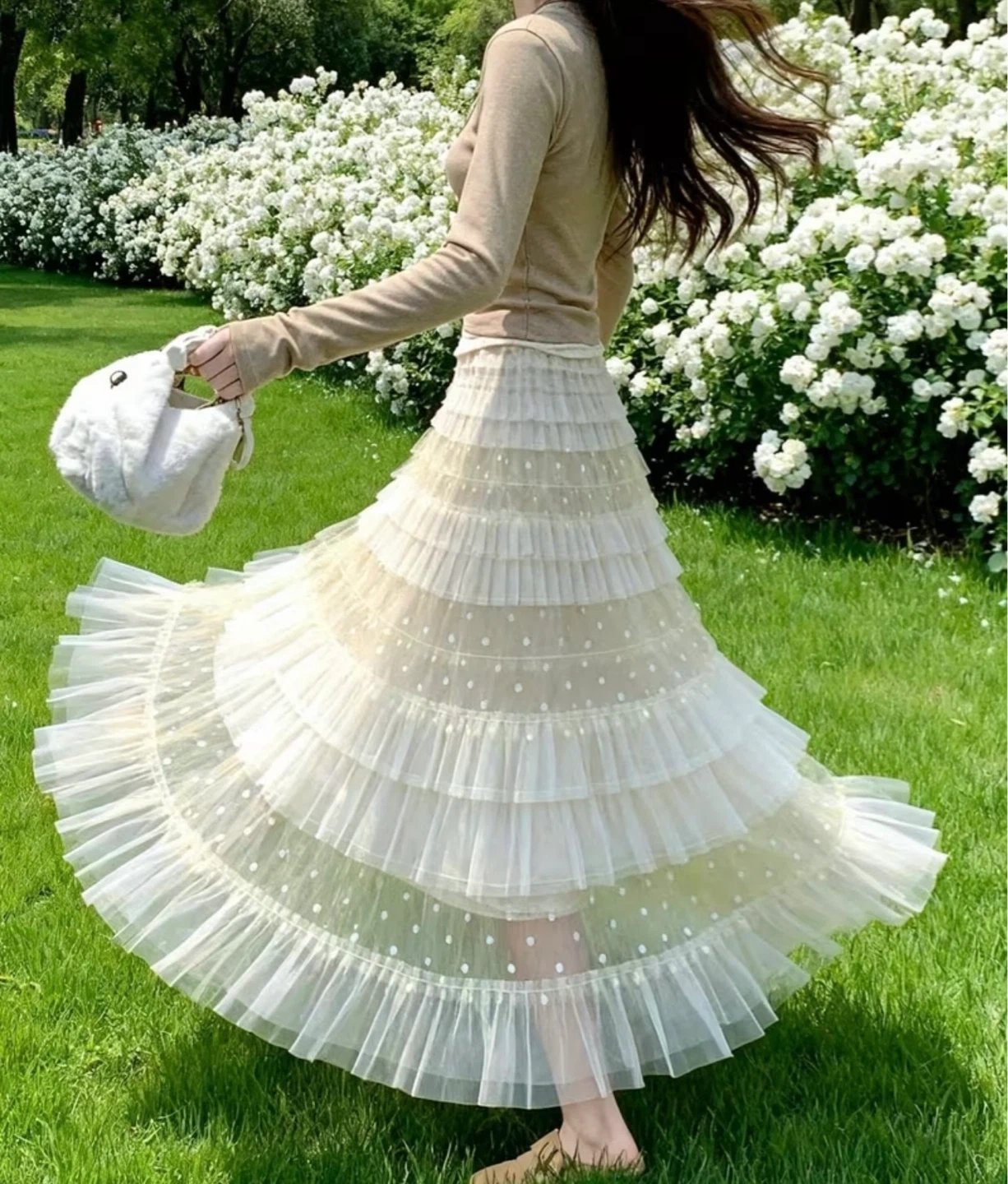 Beautiful tiered maxi skirt with ruffles. It's made of sheer tulle fabric with a cream satin waistband and hem. Sheer material!