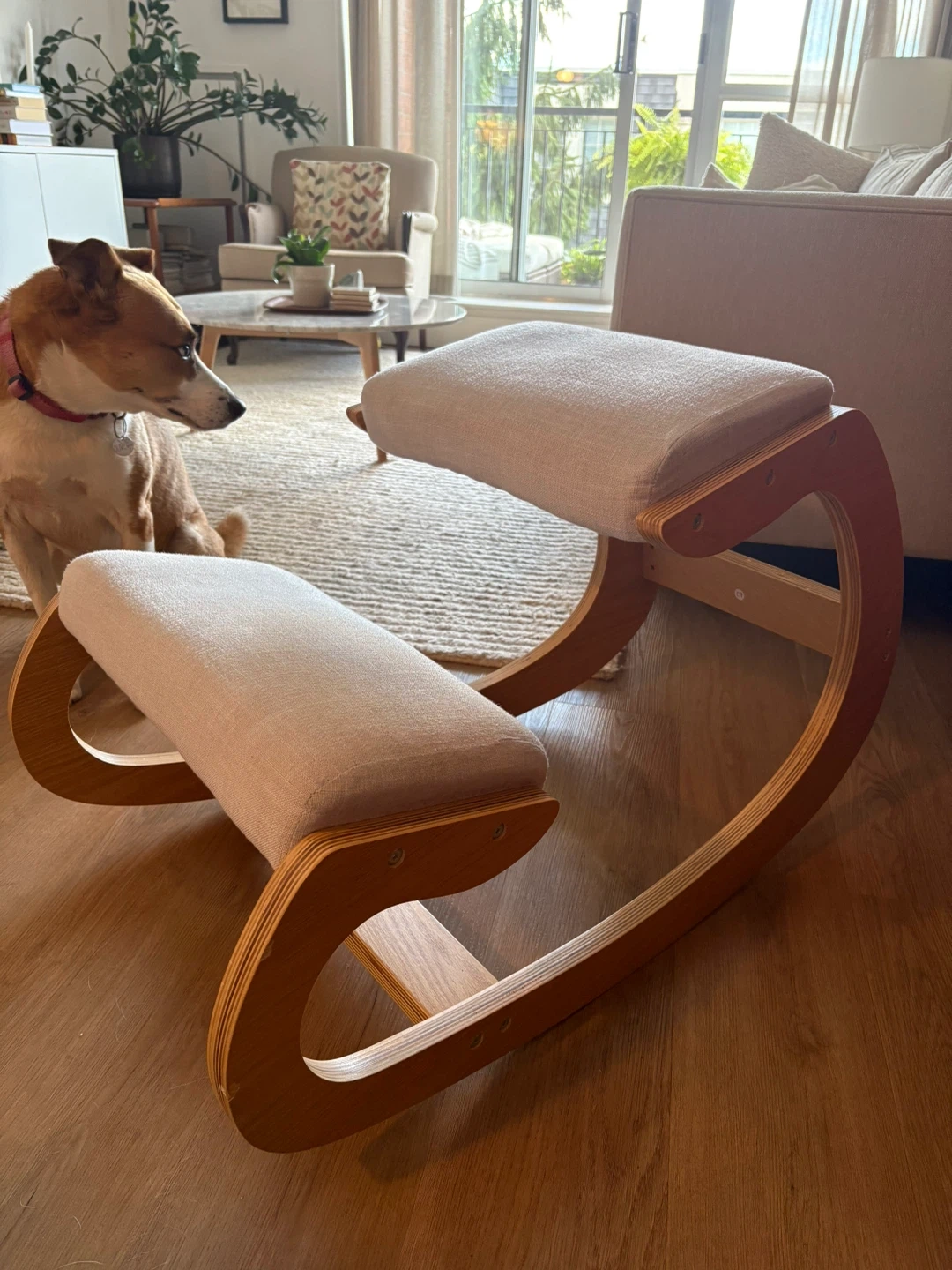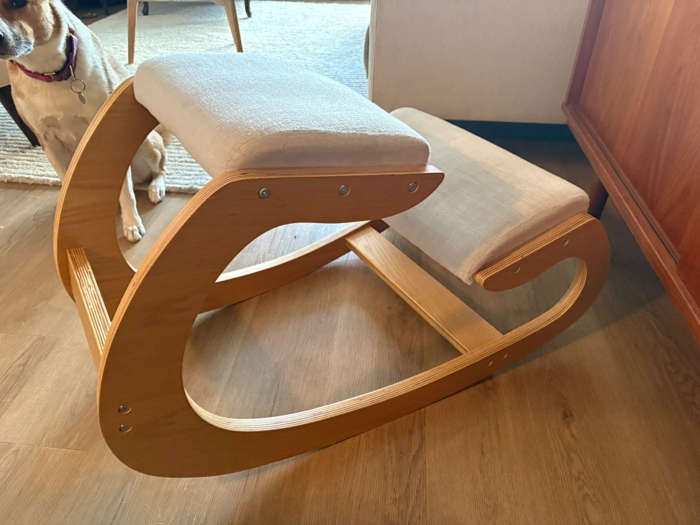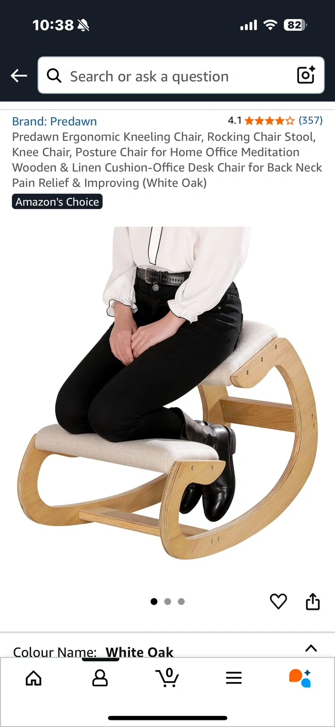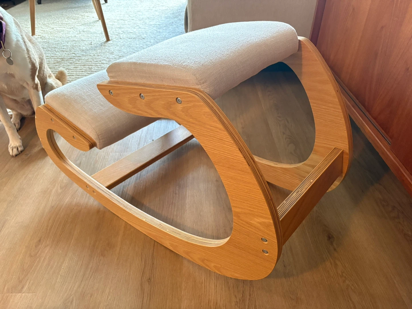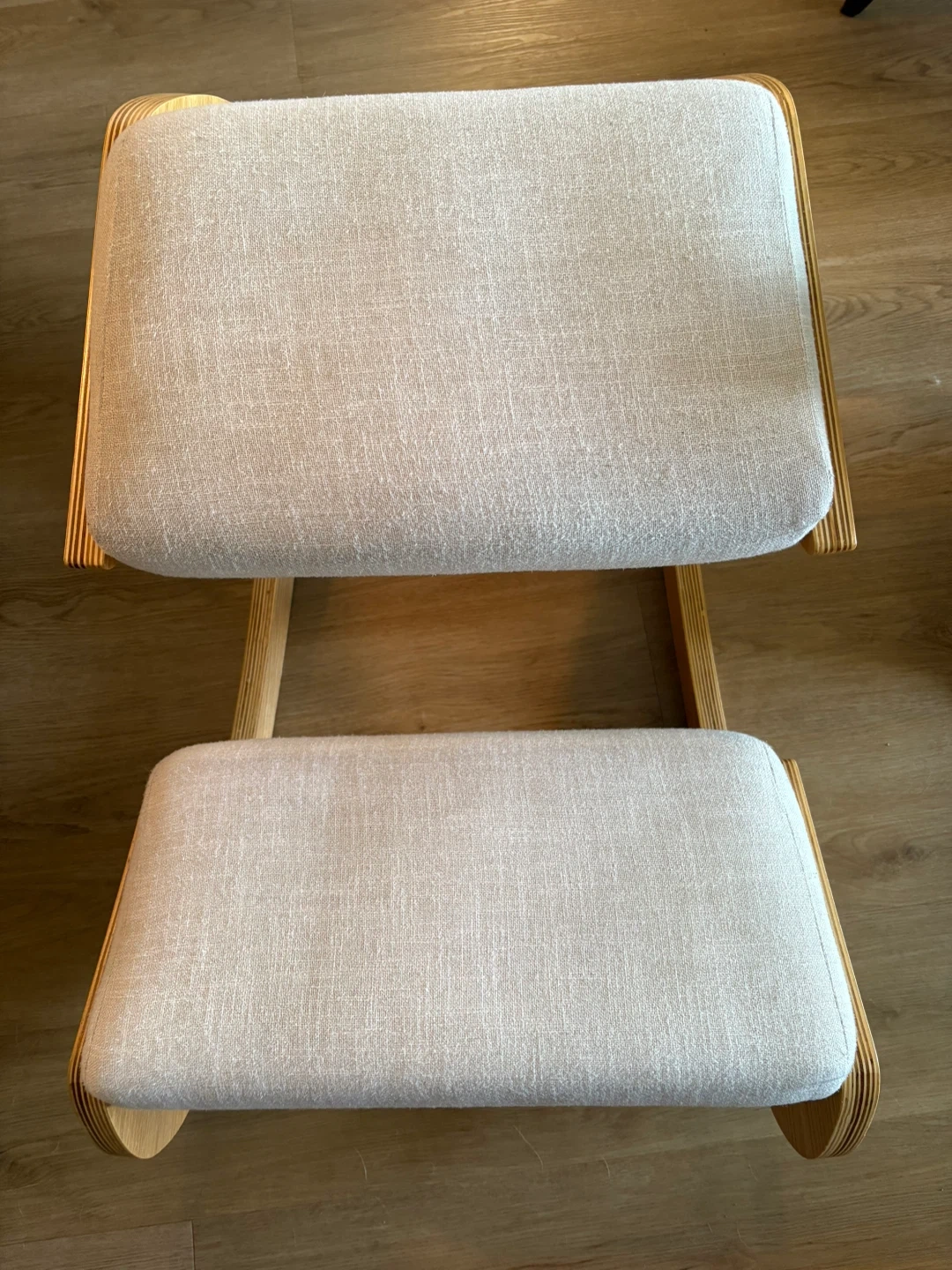 Selling a Predawn ergonomic kneeling chair in white oak. It's a unique chair that promotes better posture while you work or meditate. The chair also rocks, which is great for your core. The cushion is linen and the frame is wooden. Great for home or office use!