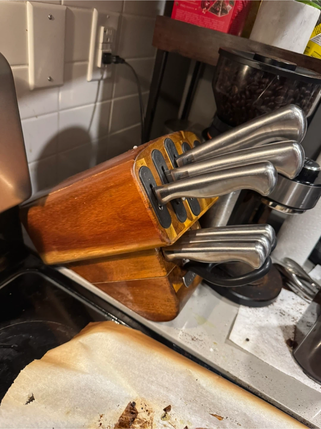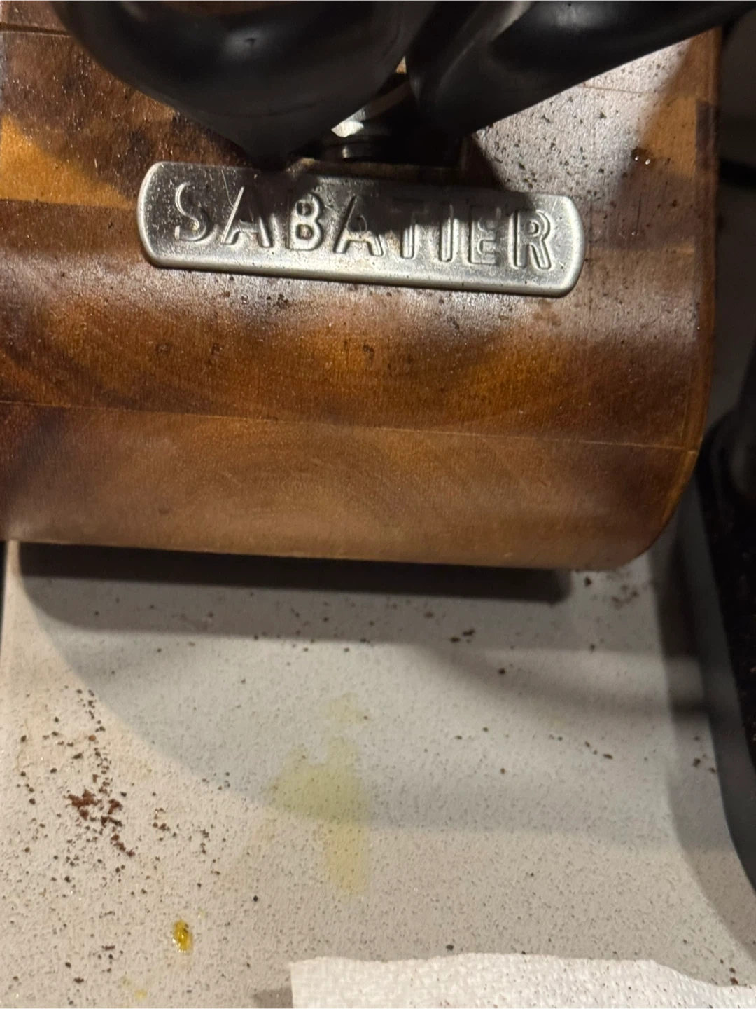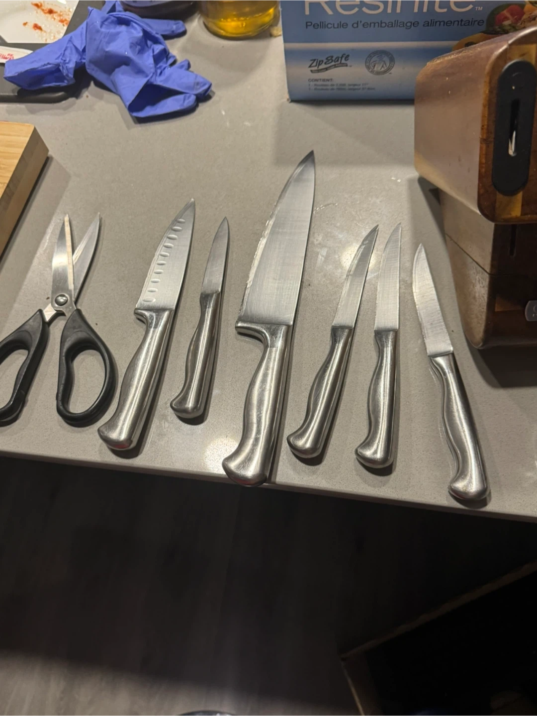Selling a Sabatier knife set ( only the number of knives shown in the picture) with it’s wooden block. The set includes a variety of knives and kitchen shears and a scissors