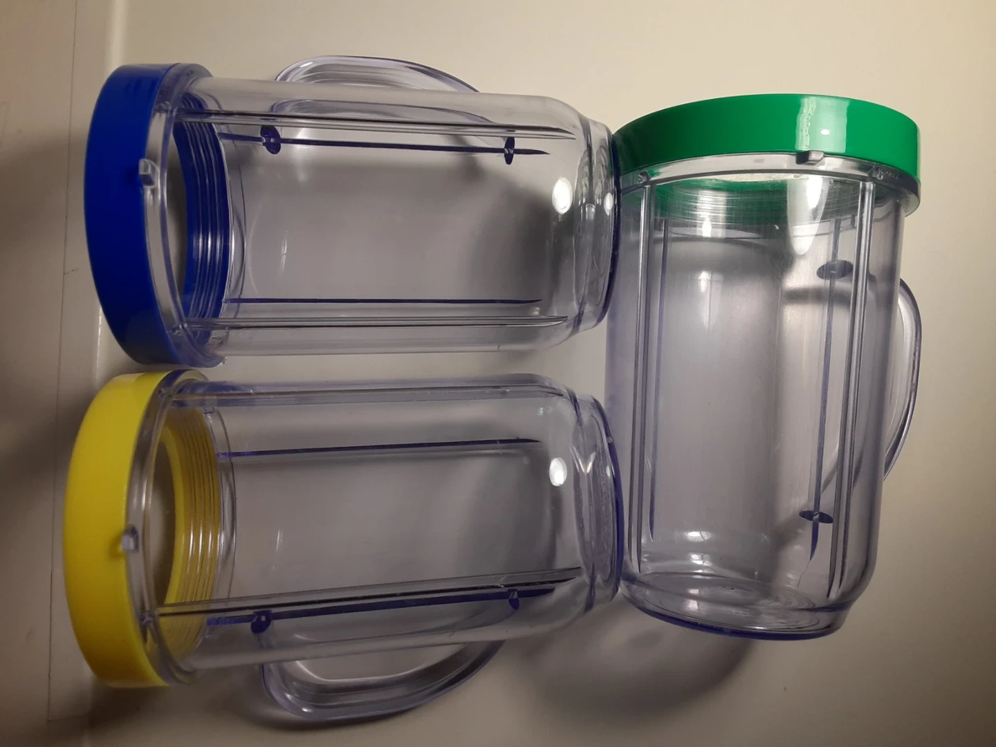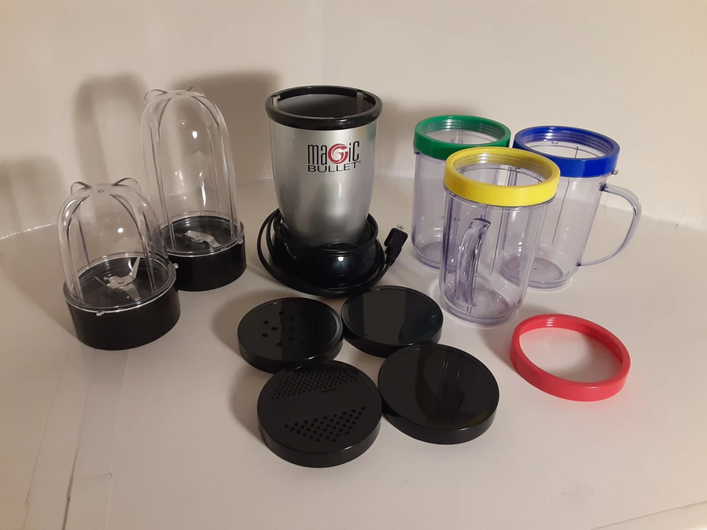 This is a Magic Bullet blender set. It includes the blender base(tested and working), three cups, two blender cups, 4 coloured cup rims(4th cup missing) multiple lids with different uses and the two different purposed blade attachments(missing box/manual/recipe book). Shows signs of age/cosmetic damage/moderate use however is in good, working condition.