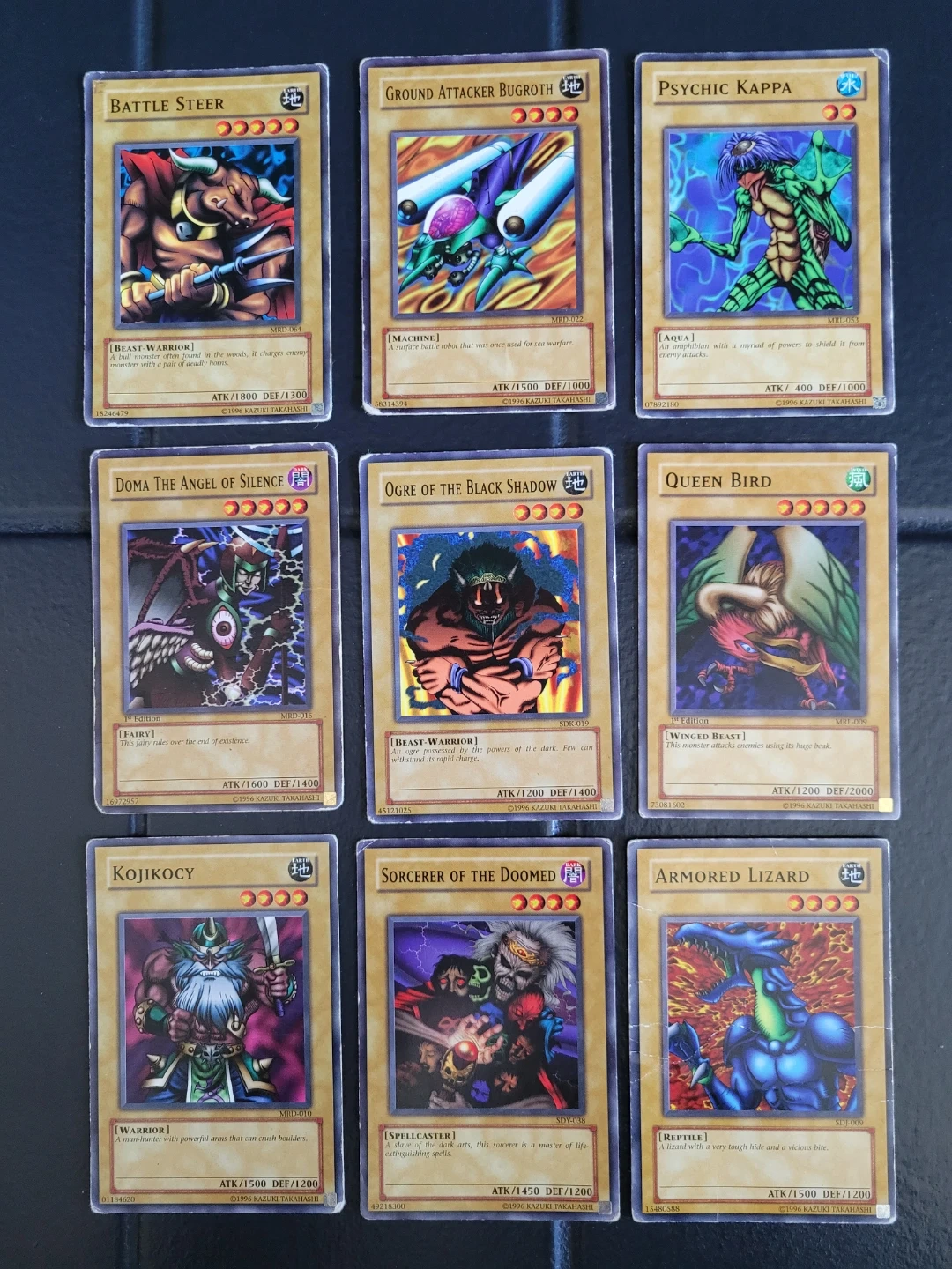 Selling 9 vintage Yu-Gi-Oh cards from early sets (MRD / LOB / SDK / SDY). All are non-holo commons in used condition.