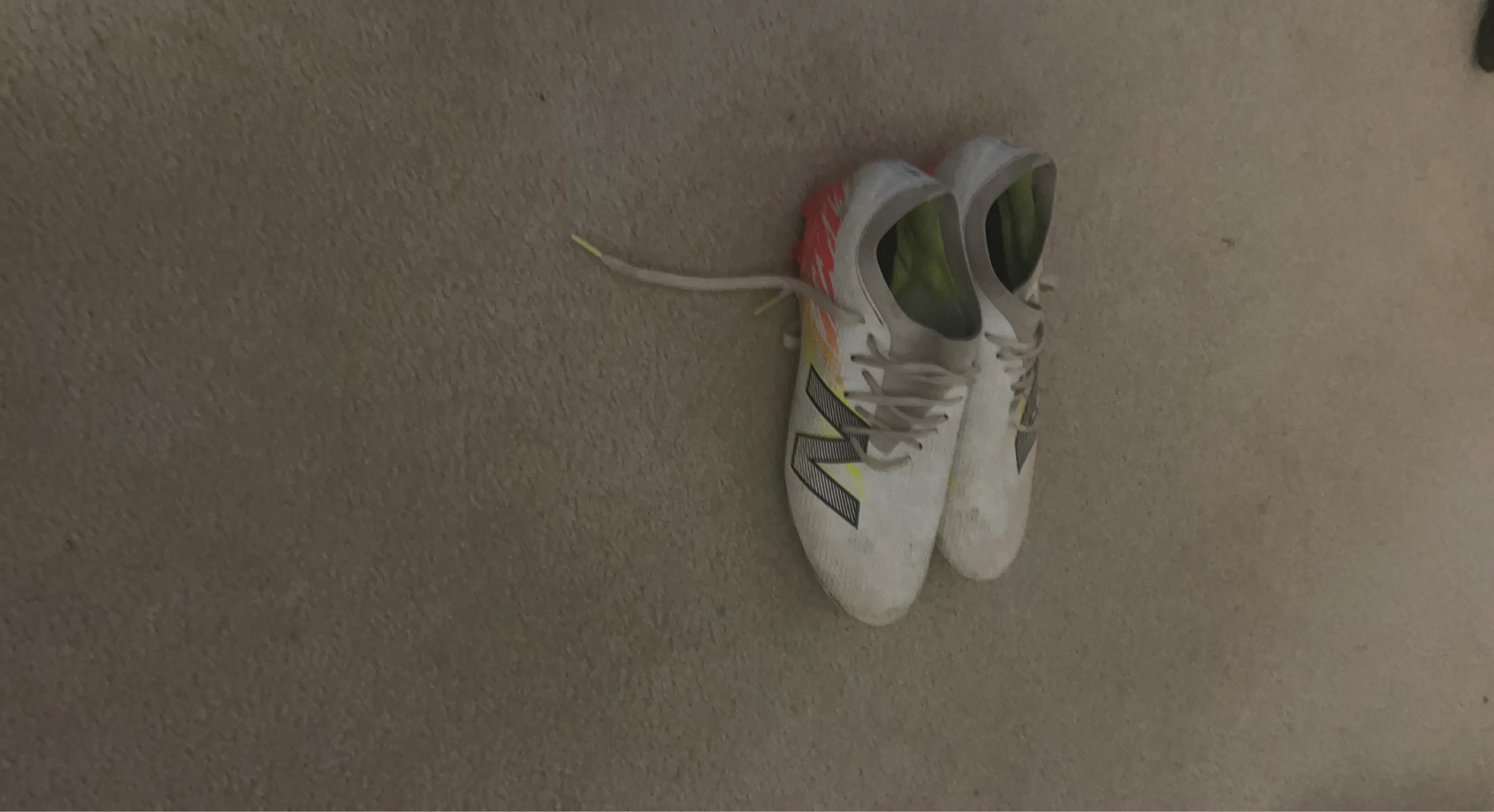These are New Balance football cleats. They're white with black and yellow accents. And were used for a season then I outgrew them