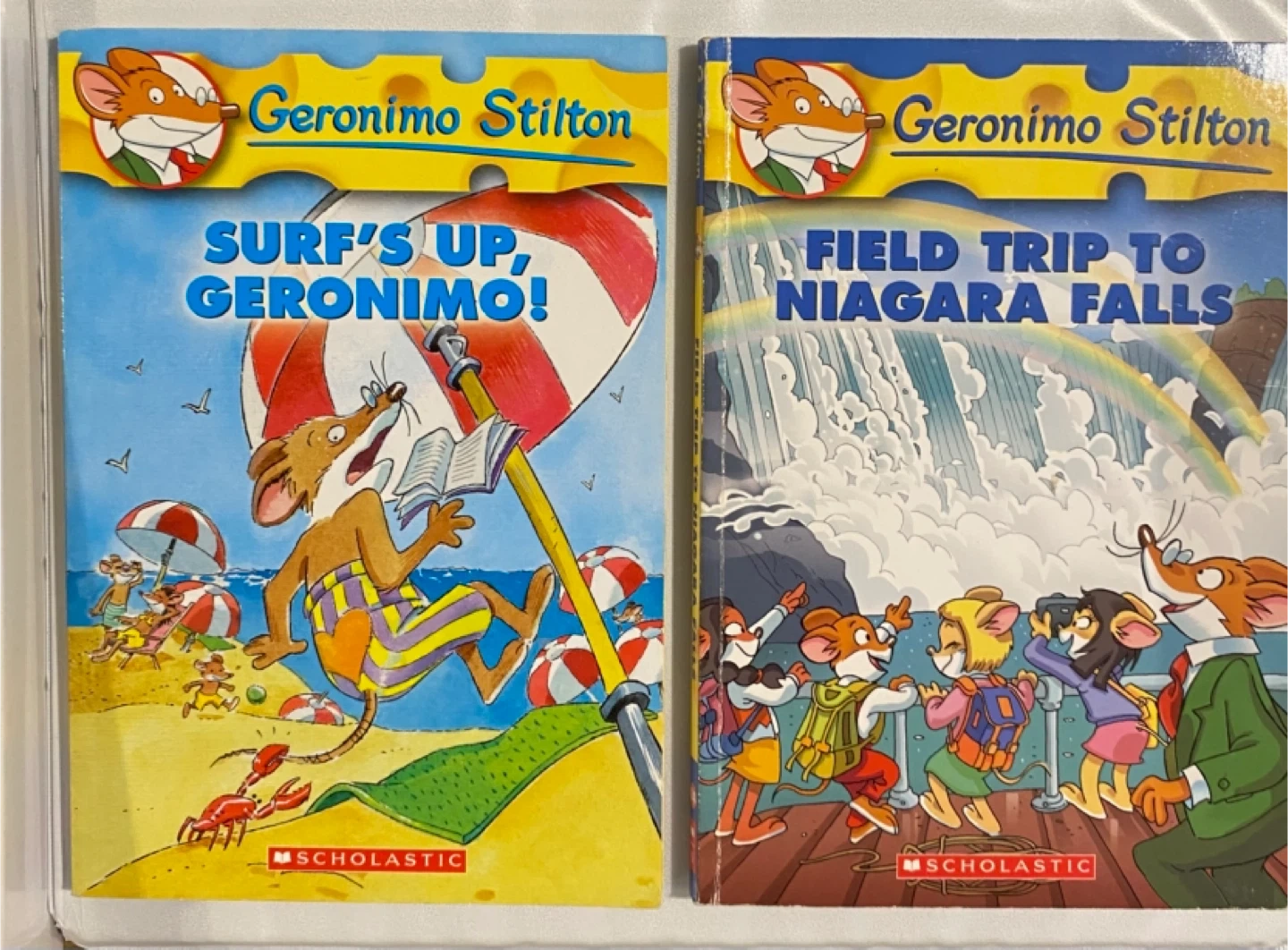 Two Geronimo Stilton adventure books: 'Surf's Up, Geronimo!' and 'Field Trip to Niagara Falls'. Both are by Scholastic. These books are great for young readers who enjoy mysteries and fun adventures.