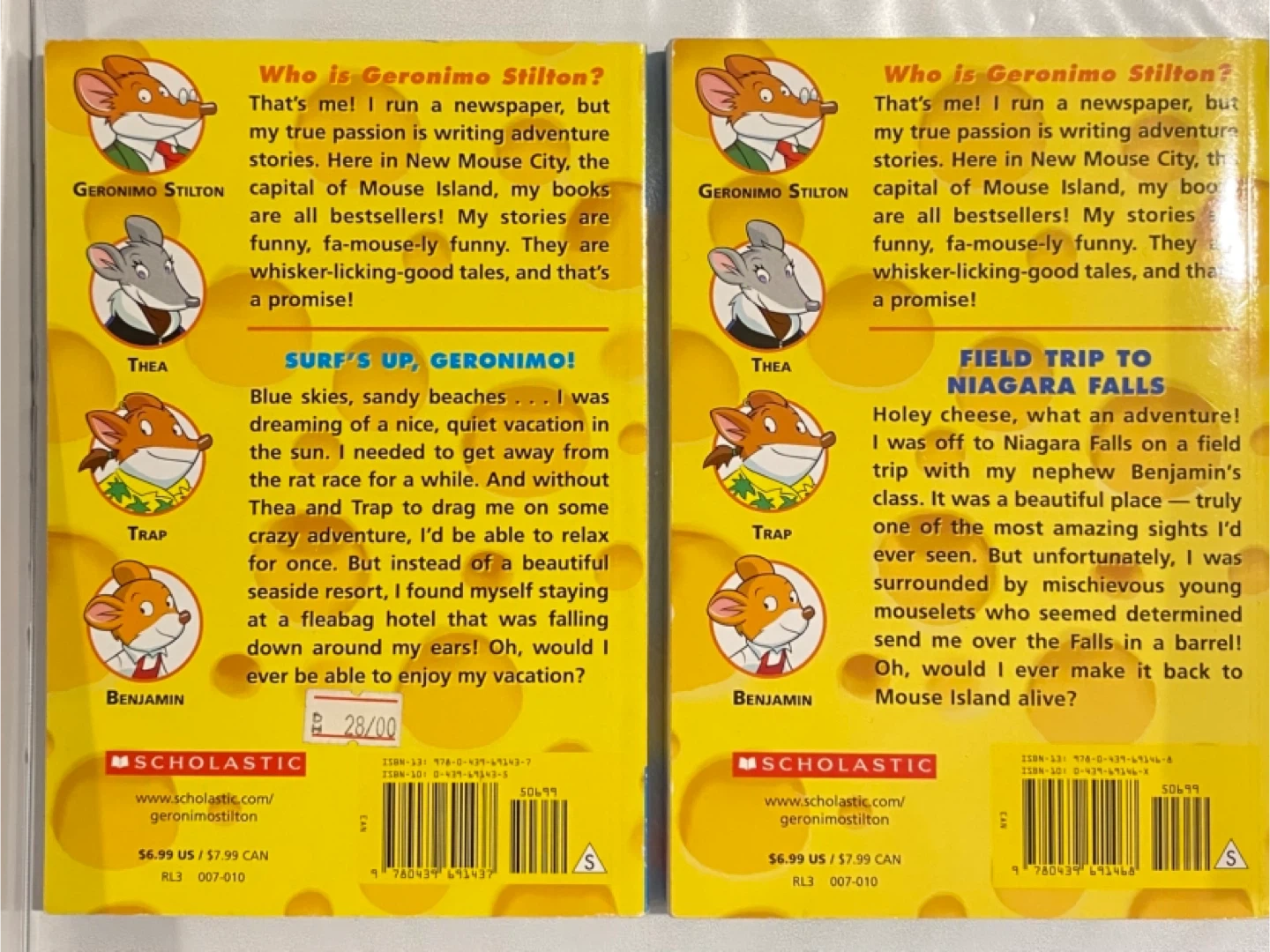 Two Geronimo Stilton adventure books: 'Surf's Up, Geronimo!' and 'Field Trip to Niagara Falls'. Both are by Scholastic. These books are great for young readers who enjoy mysteries and fun adventures.