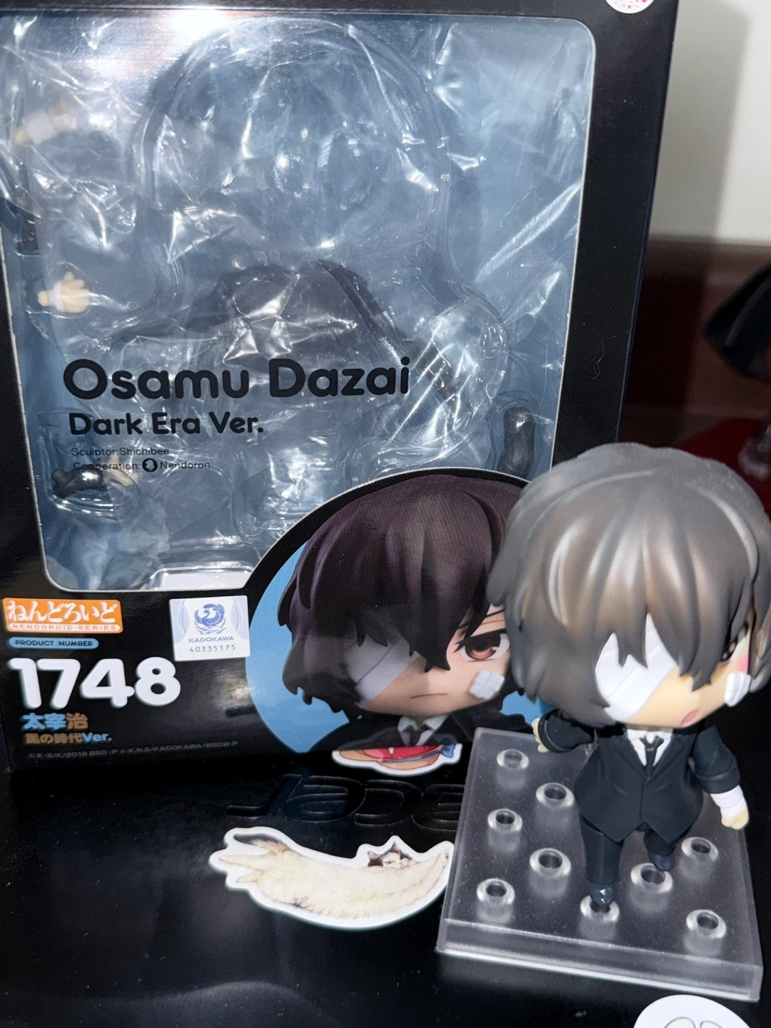 This is the Osamu Dazai Nendoroid figure from Good Smile Company, Dark Era Ver., product number 1748. It includes various accessories for posing. This collectible is great for fans of the series!