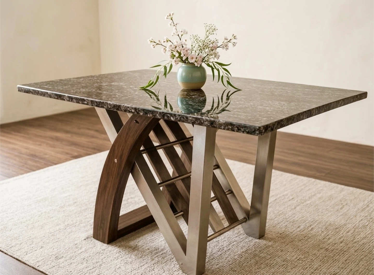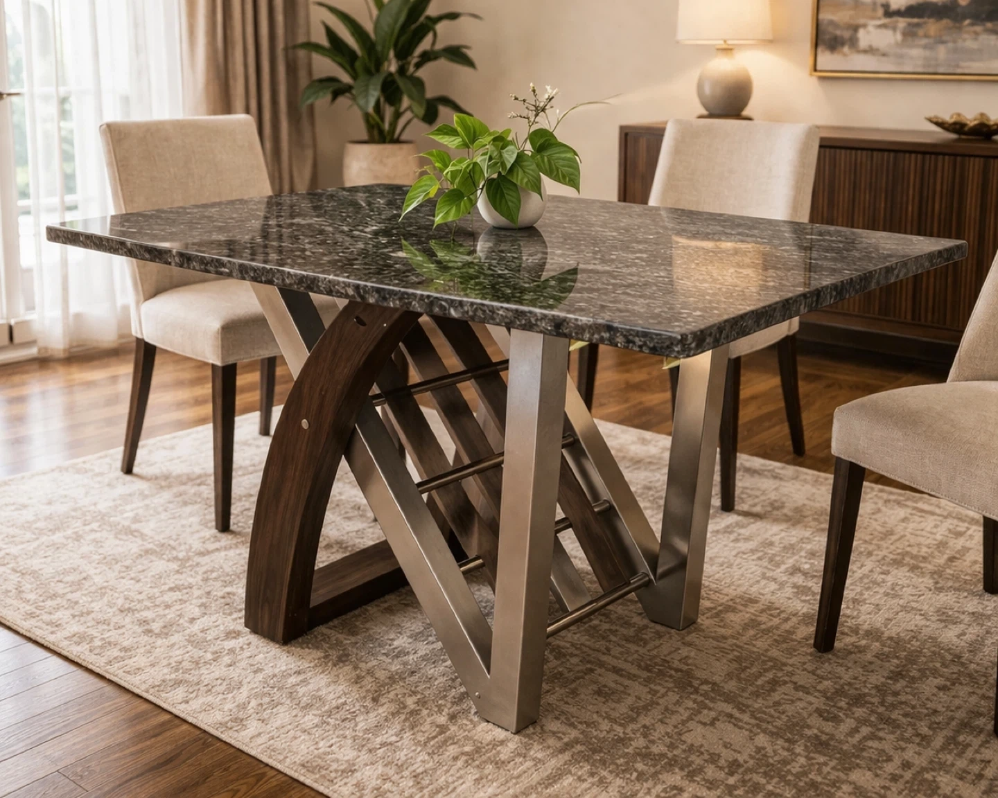 A stylish dining table featuring a granite top and a unique base constructed from dark wood and brushed metal. It's suitable for seating four to six people. This table's modern design would complement many dining room decors.