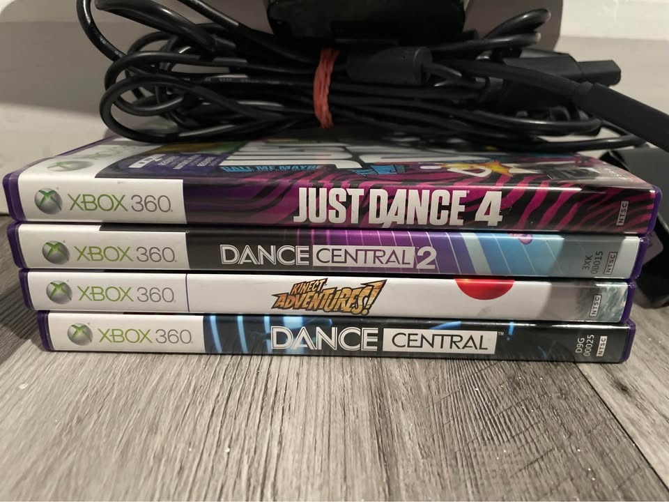 4 games and Xbox 360 Kinect with the adapter to either plug into the wall or to plug into the Xbox! Everything has been tested and works great!