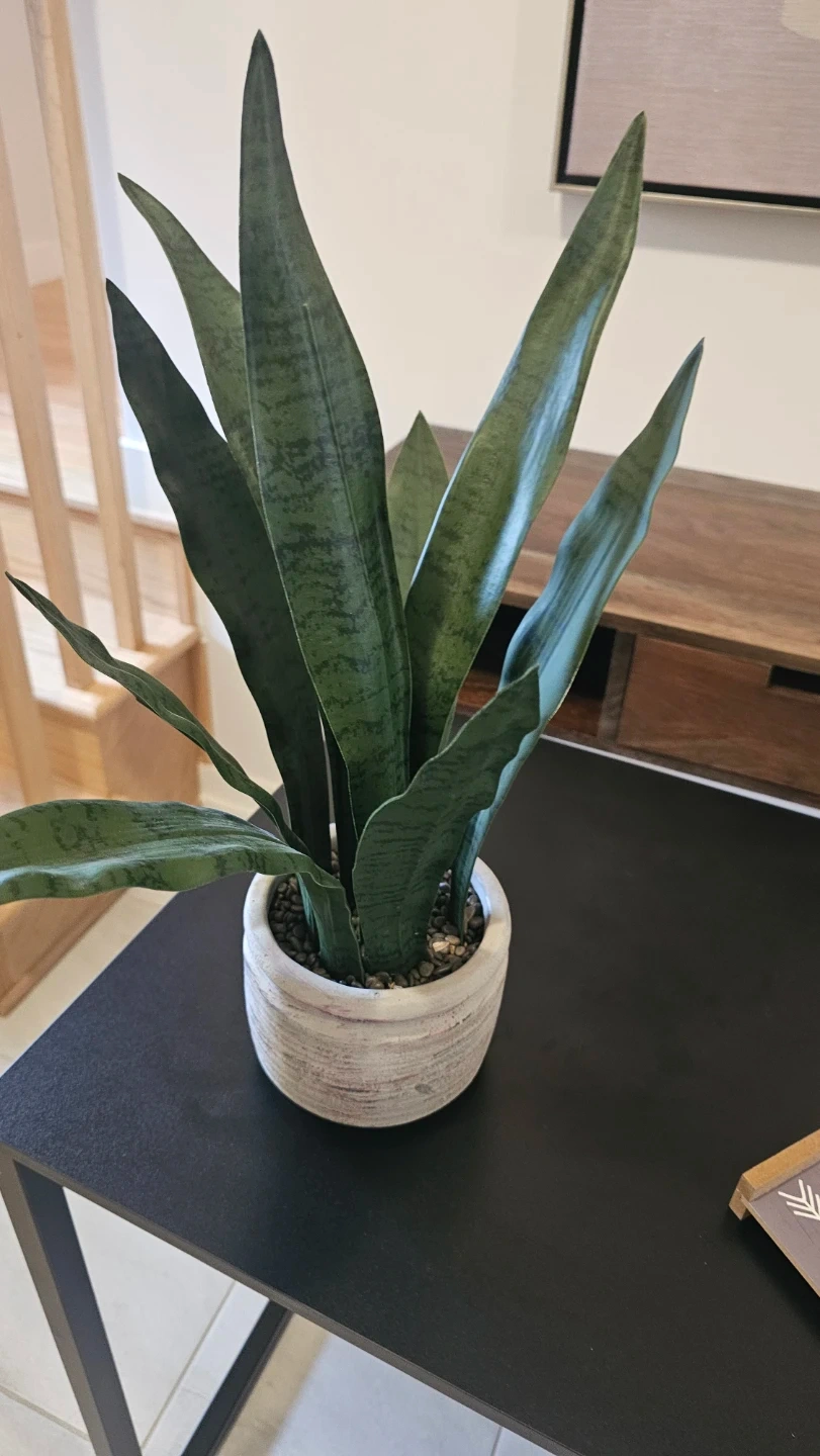 A beautiful snake plant with upright, sword-like leaves. It's planted in a rustic, textured pot with small stones on top. This plant's dark green foliage with subtle grey patterns makes it a striking addition to any room.