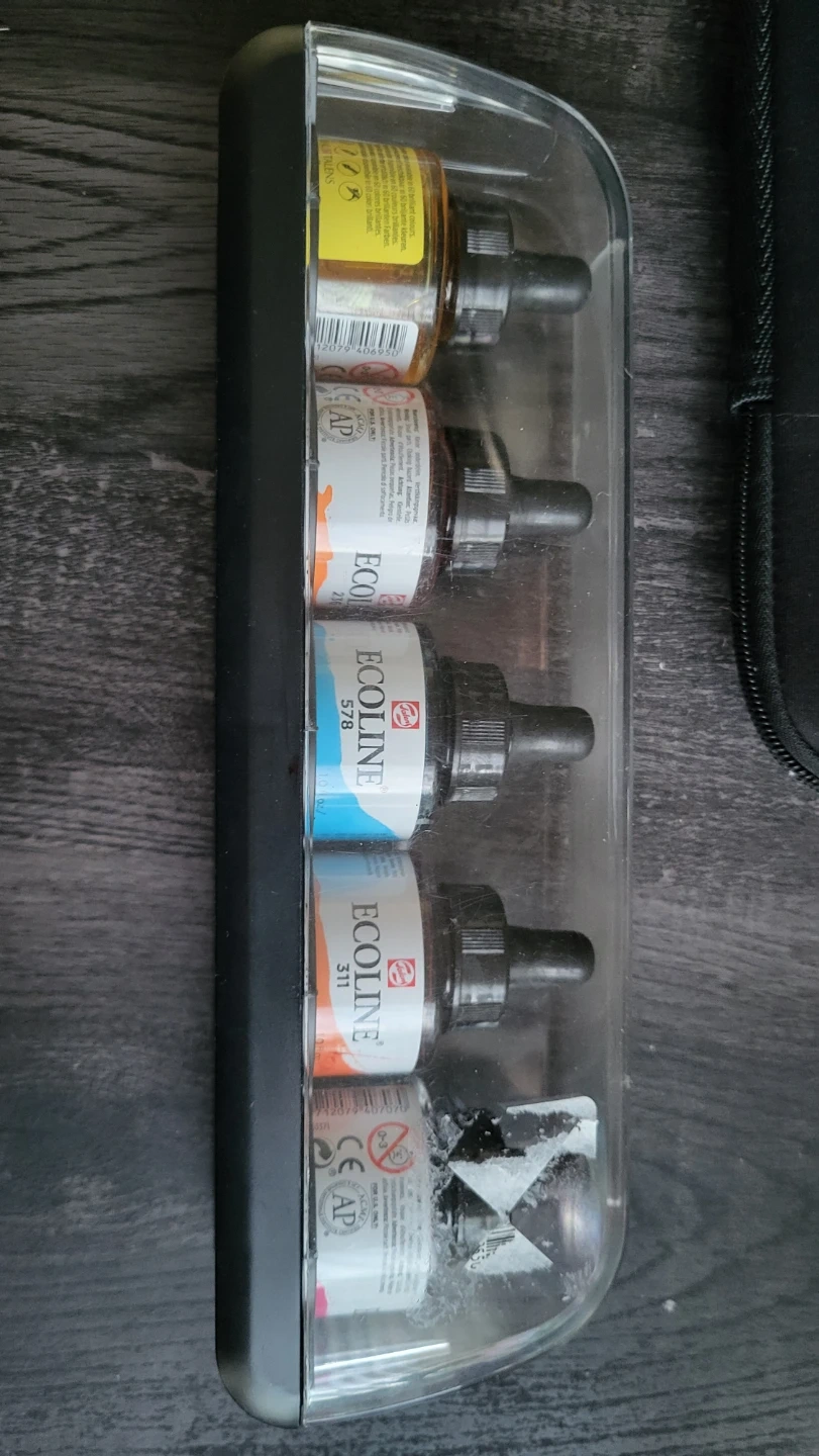 This set includes five bottles of Talens Ecoline watercolour ink. The colours are 205 (yellow), 311 (rose), 318 (ochre), 370 (royal blue), and 578 (cyan). It's liquid watercolour ink, perfect for various art projects. Made for artists!