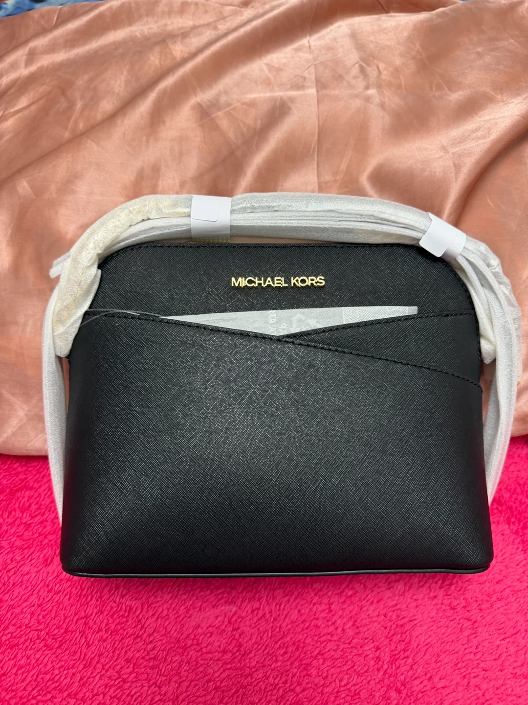 This is a Michael Kors black leather crossbody bag. It's made from saffiano leather and features a zip closure. The bag's dimensions are approximately 9"W x 6"H x 3"D. It's a classic size for everyday use!