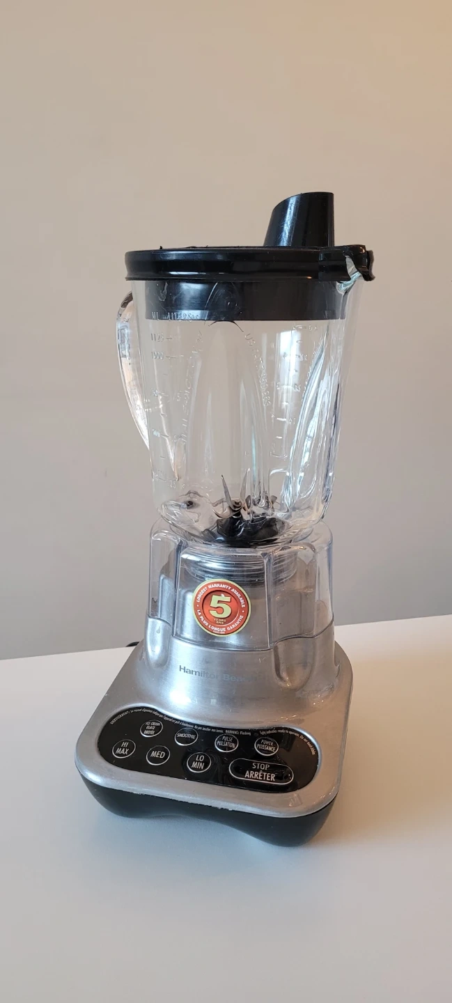 This Hamilton Beach blender features multiple speed settings, including high, max, medium, low, and 1.0 min. It's designed for various blending tasks, from crushing ice to making smoothies. The pitcher appears to be glass and has measurement markings. This appliance would be useful for quick meal prep or beverage making.