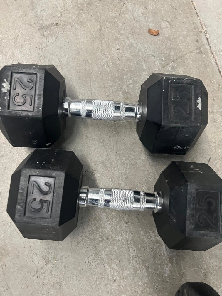 Selling a set of hex dumbbells (25 lbs each) and some weight plates (10 lbs each). They've been used but are still in good condition for your home gym!