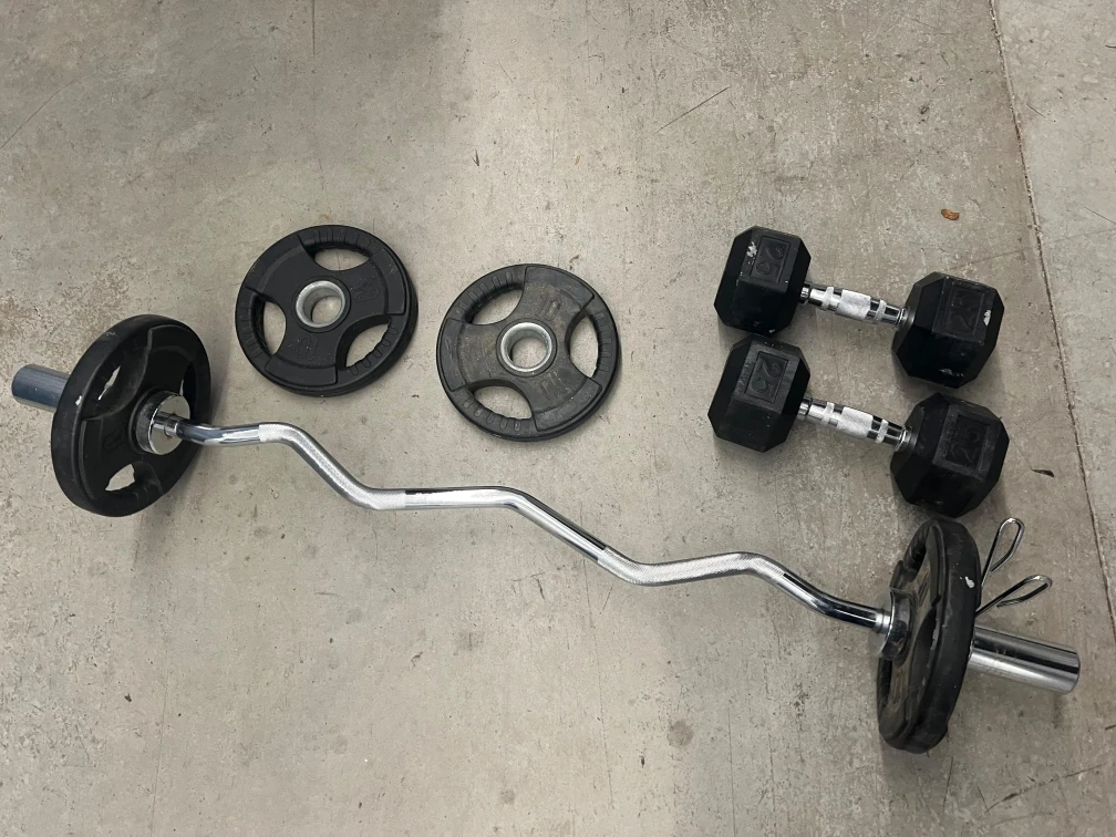 Selling a set of hex dumbbells (25 lbs each) and some weight plates (10 lbs each). They've been used but are still in good condition for your home gym!
