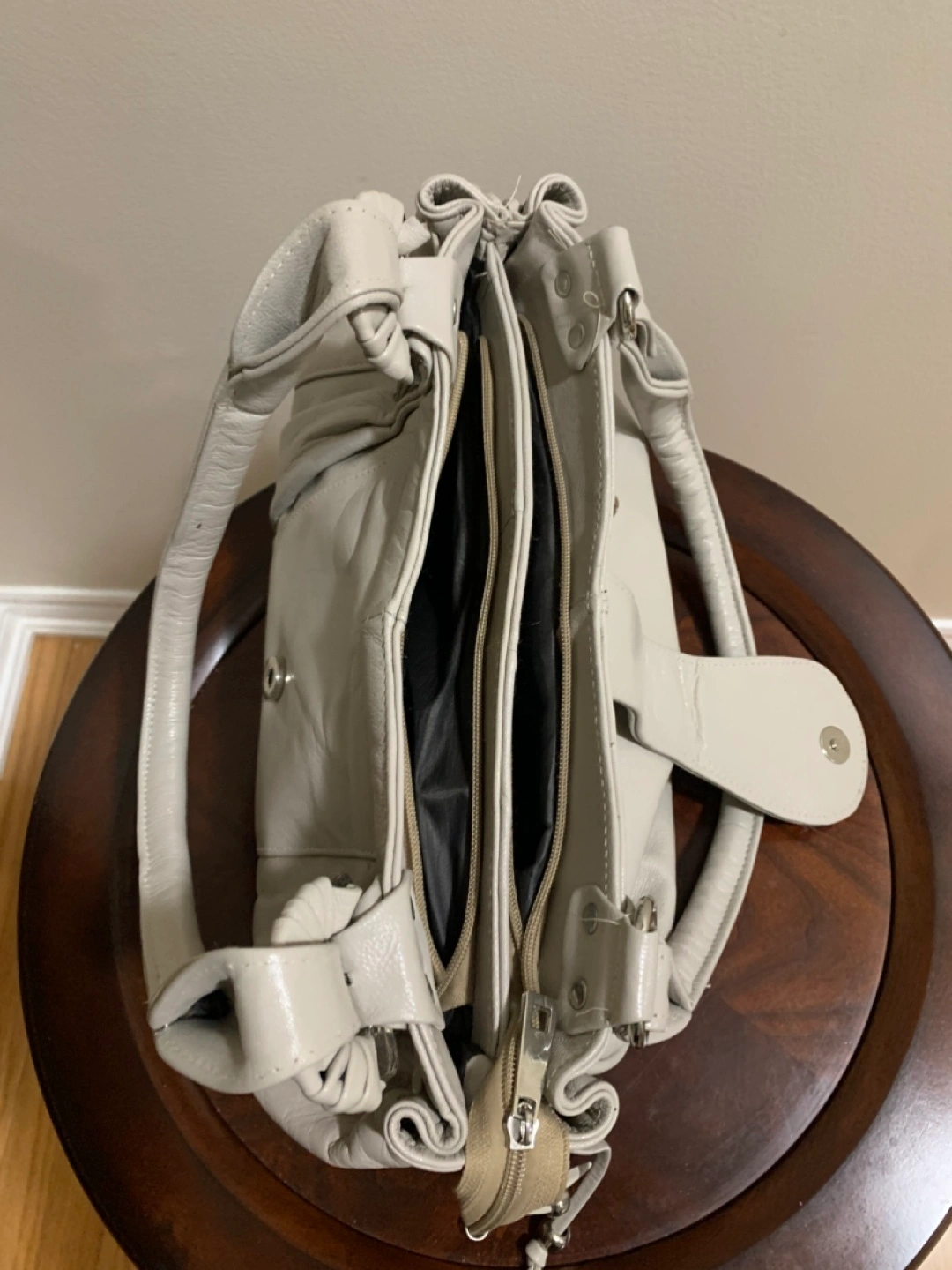 Beautiful pale grey leather handbag. Features two main compartments and a zippered pocket. Top handles and silver-toned hardware from Egypt. Excellent for everyday use.