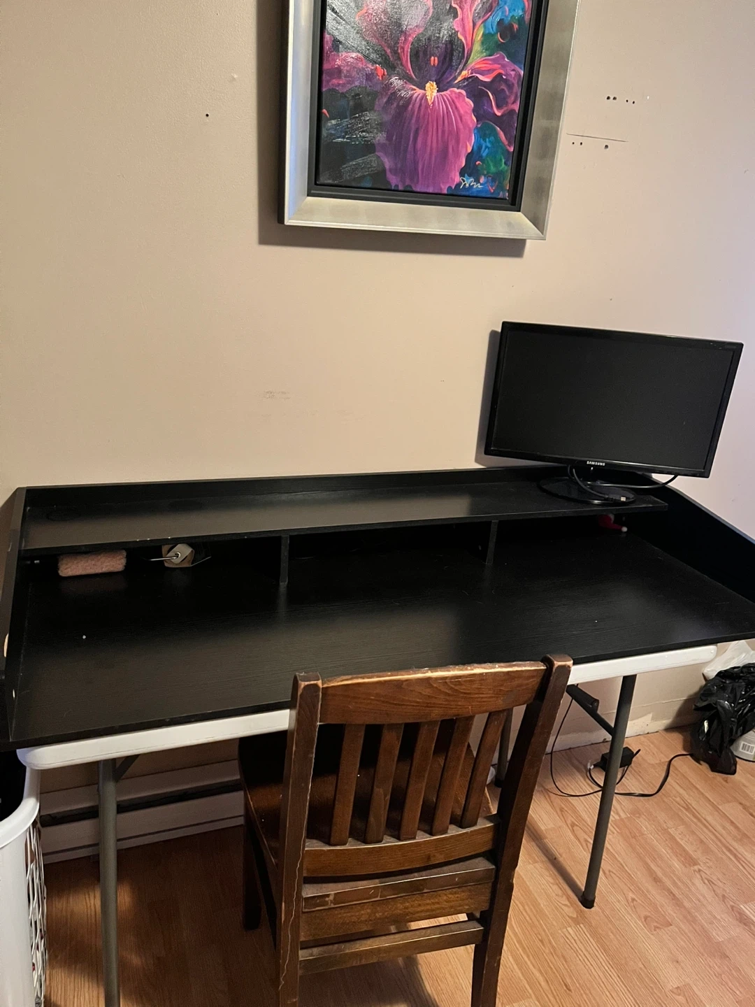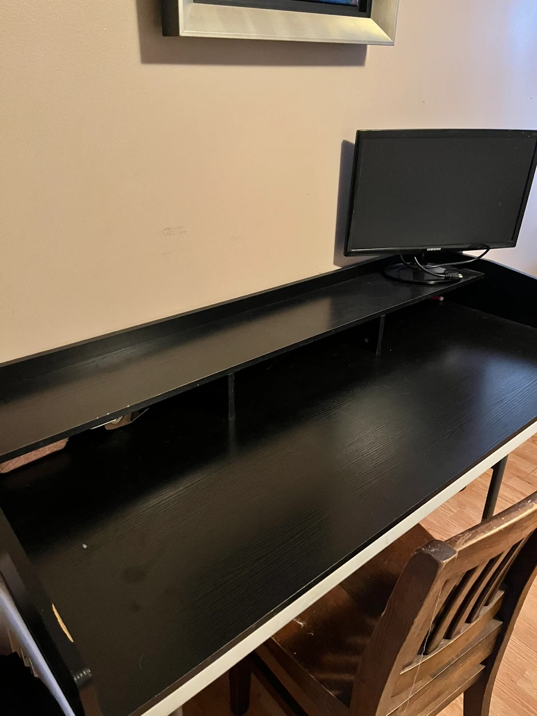 Selling a black desk. It's in good condition and would be perfect for a home office or student. It has a shelf above the desk for a monitor or other items