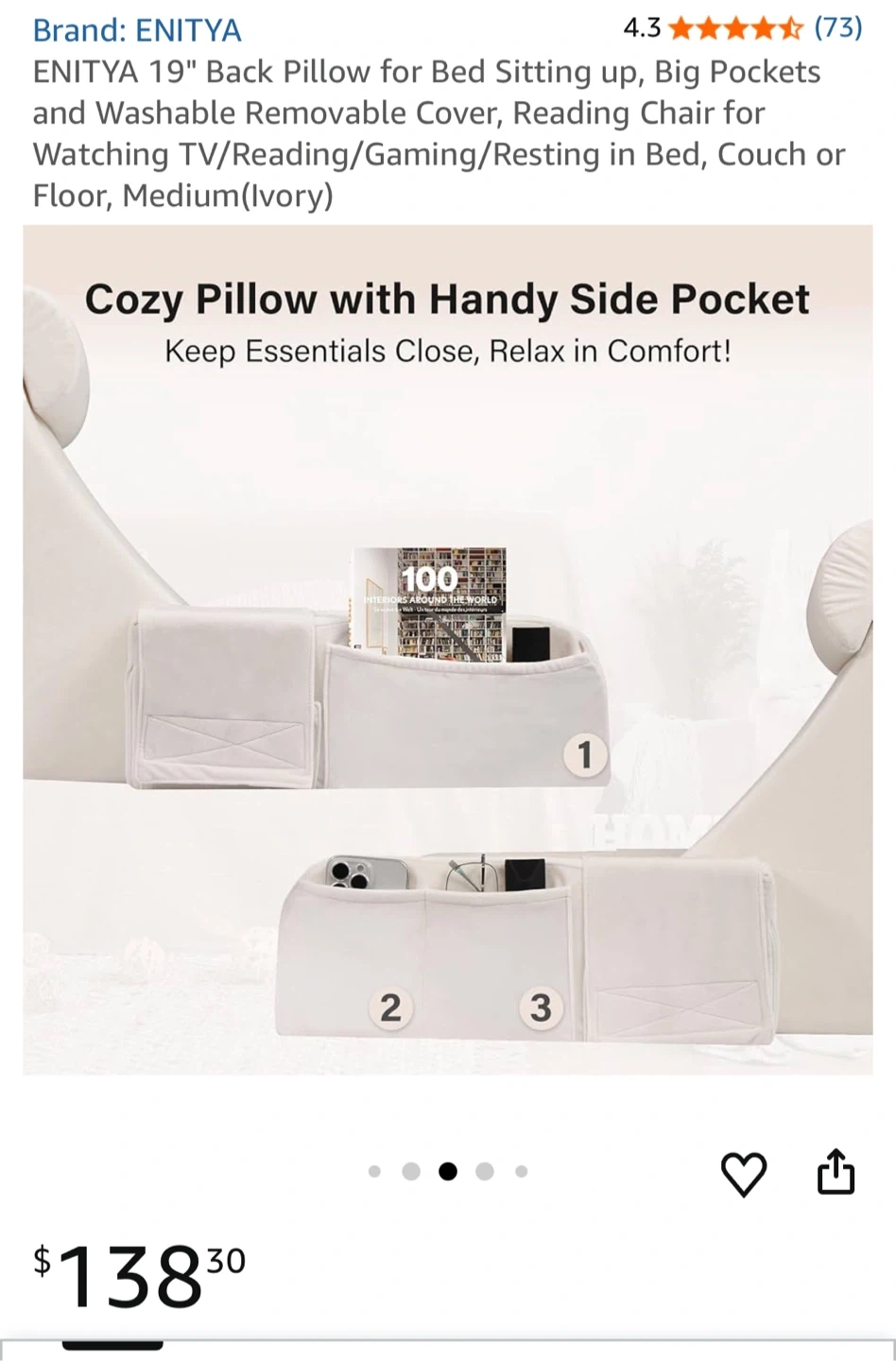 19" Back Pillow for Bed Sitting up, Big Pockets and Washable Removable Cover, Reading Chair for Watching TV/Reading/Gaming/Resting in Bed, Couch or Floor, Medium(Ivory)