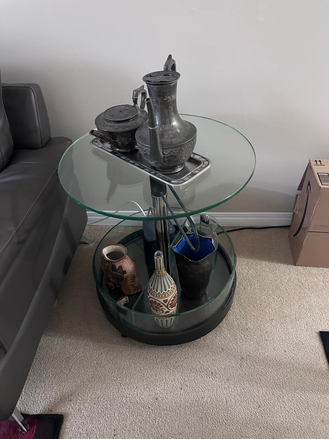 Selling a round glass accent table! It has two tiers, great for displaying decorative items or for use as a side table next to a sofa or chair. The height is 24" and 21" round across.