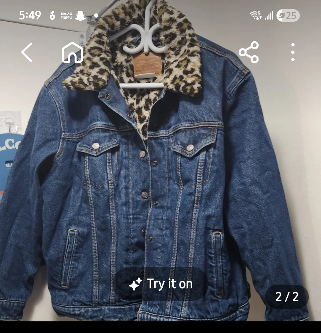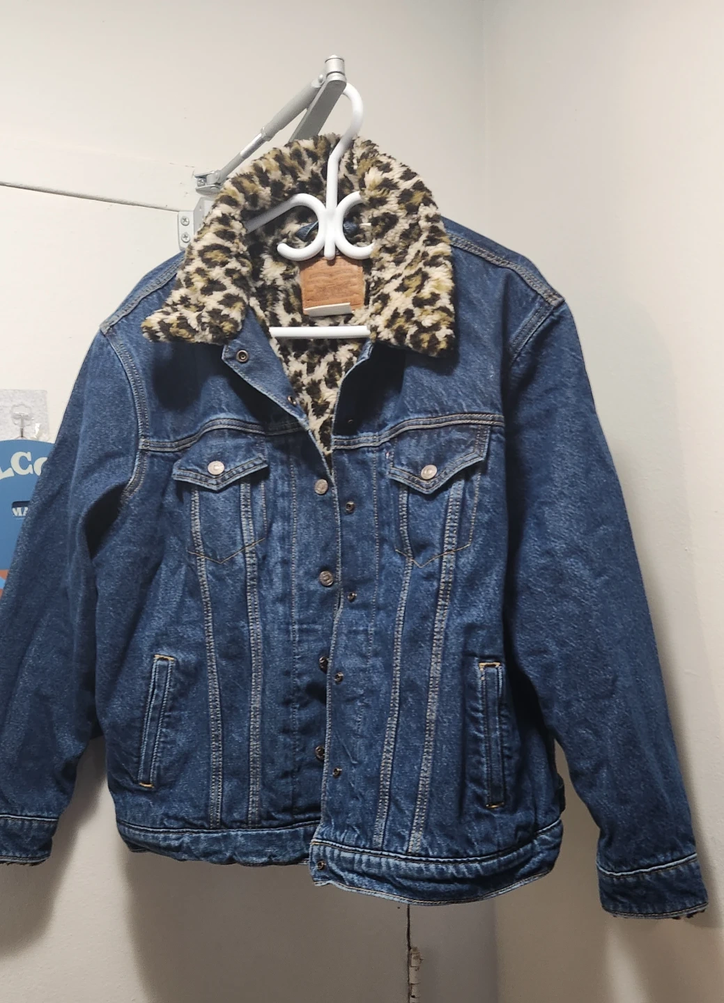 Classic blue denim jacket featuring a cozy leopard print faux fur collar. It's got two chest pockets and button closures. This jacket's a good layer for cooler weather.