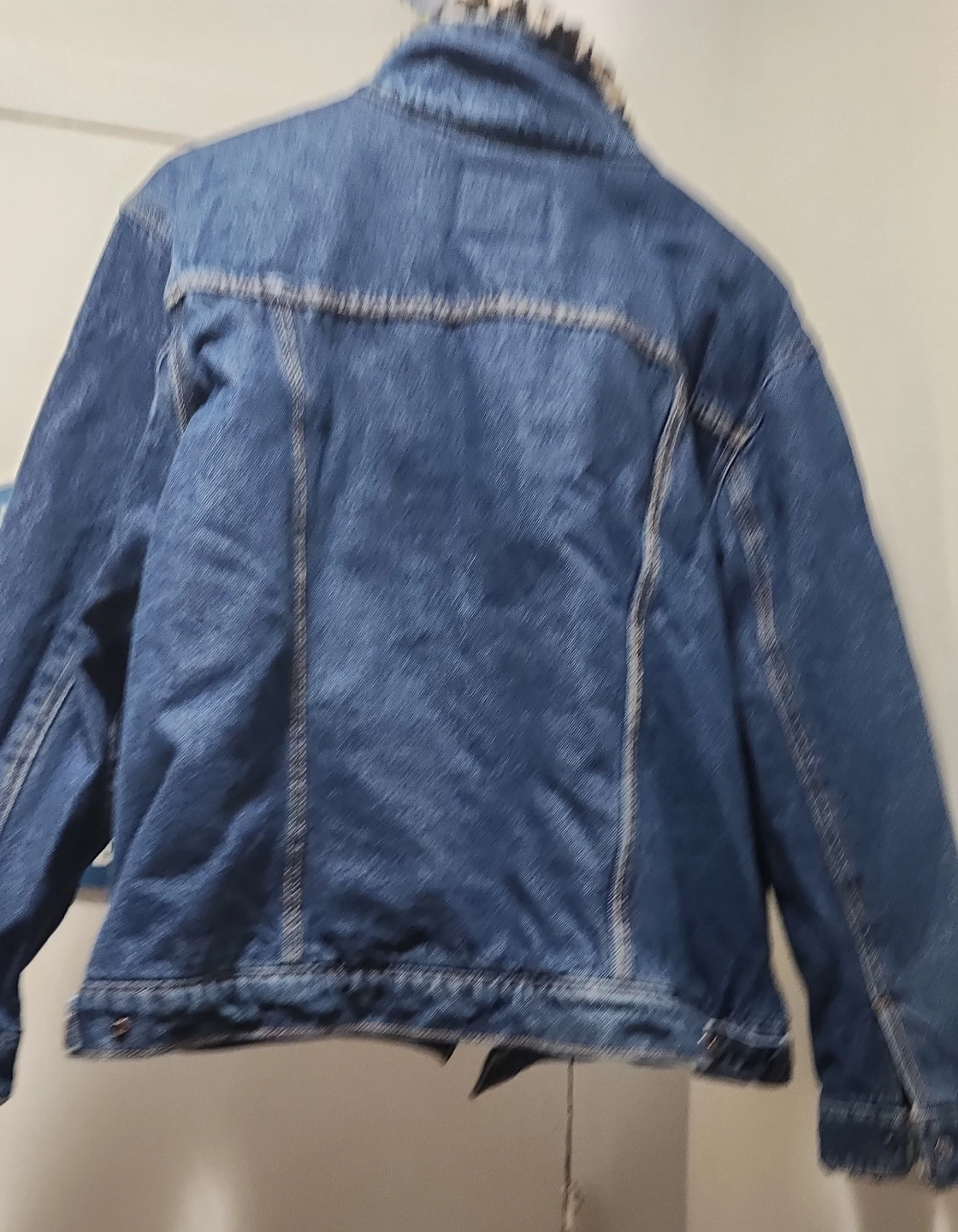 Classic blue denim jacket featuring a cozy leopard print faux fur collar. It's got two chest pockets and button closures. This jacket's a good layer for cooler weather.