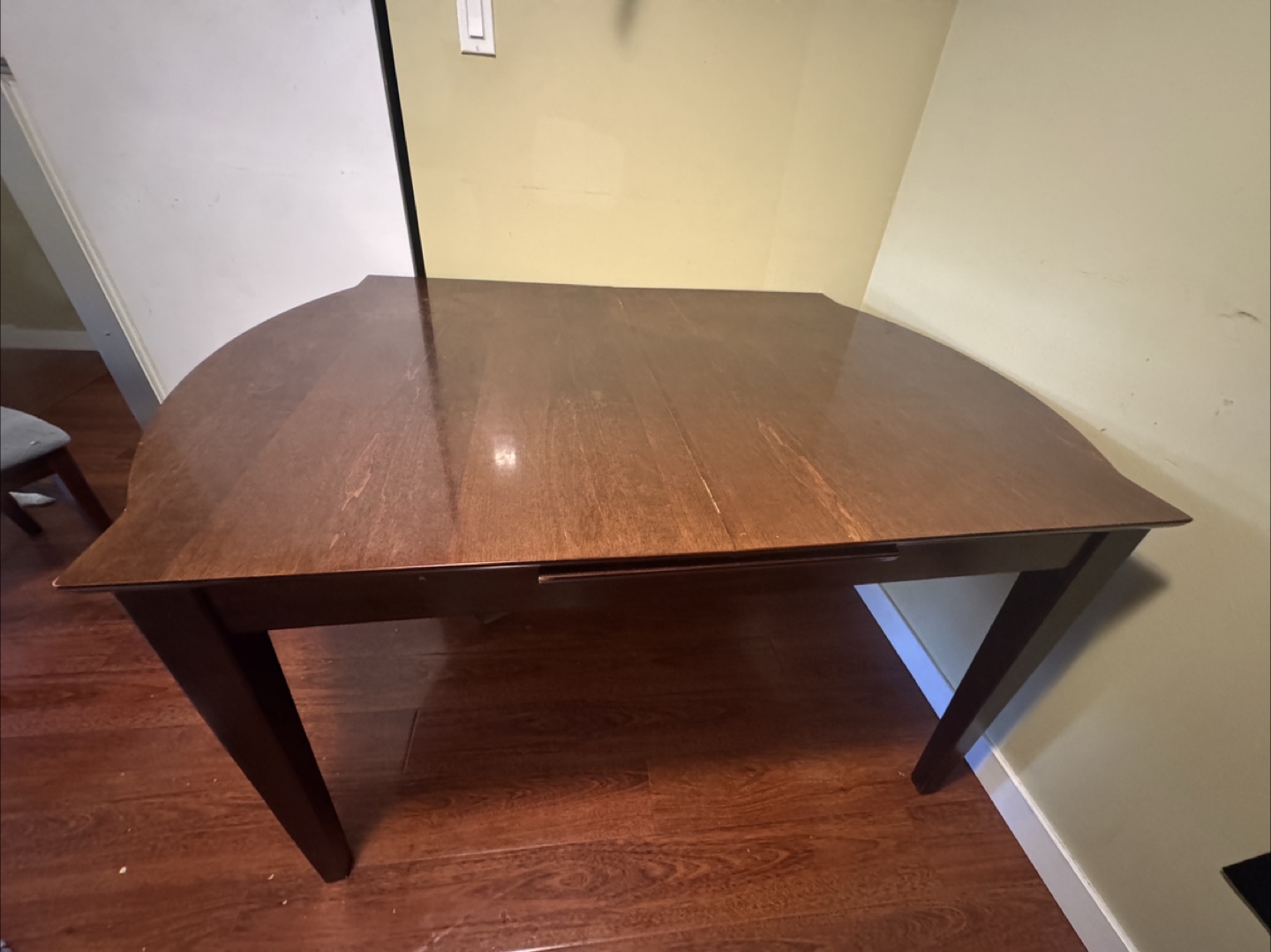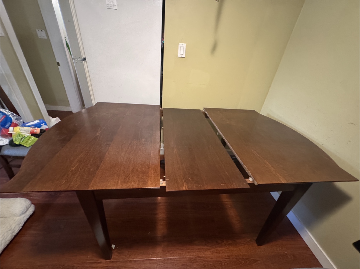 🪑✨ Extendable Brown Dining Table + 4 Chairs – Seats 6 to 8 – Free Looking for a practical and stylish dining table? This dark brown extendable table comfortably fits 6 people, and can be expanded to seat 8 guests – perfect for family meals, game nights, or gatherings. 🟢 The table is in great condition 🔴 The chairs have visible scratches (thanks to my silly cat 😅), but they’re still sturdy and can be easily covered with cushions. 📏 Measurements: – Closed: 1.18 m (L) × 1.00 m (W) – Extended: 1.28 m (L) × 1.02 m (W) 💰 Price: Free 📍 Pickup only near Burnaby Hospital (no car for delivery) ⏳ Need to take it soon – message me if interested!