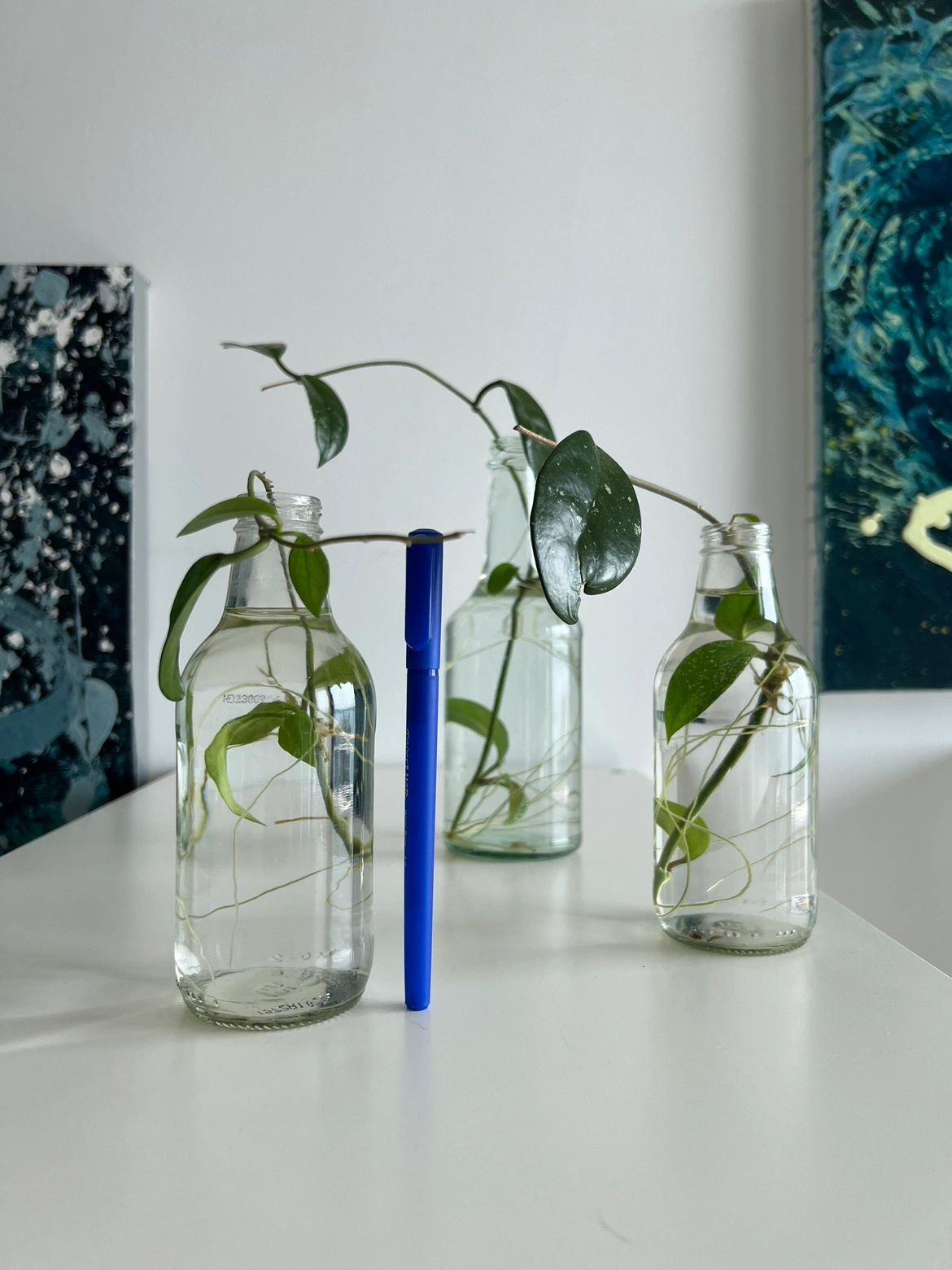 Hoya plant clippings growing in 6” bottles.
