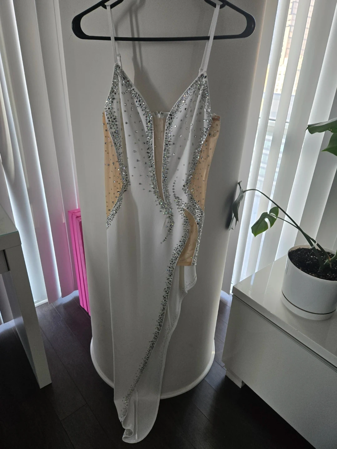 This stunning white maxi dress features intricate rhinestone detailing and sheer mesh panels. It has a flattering asymmetrical hemline and adjustable spaghetti straps. Perfect for a special occasion!