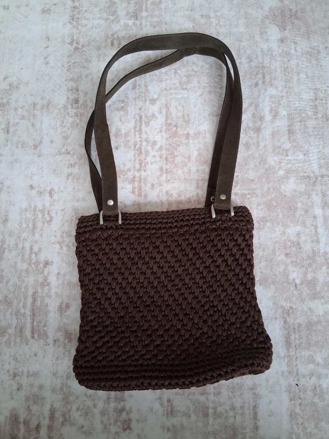Brown Crochet Shoulder Bag with Suede Straps