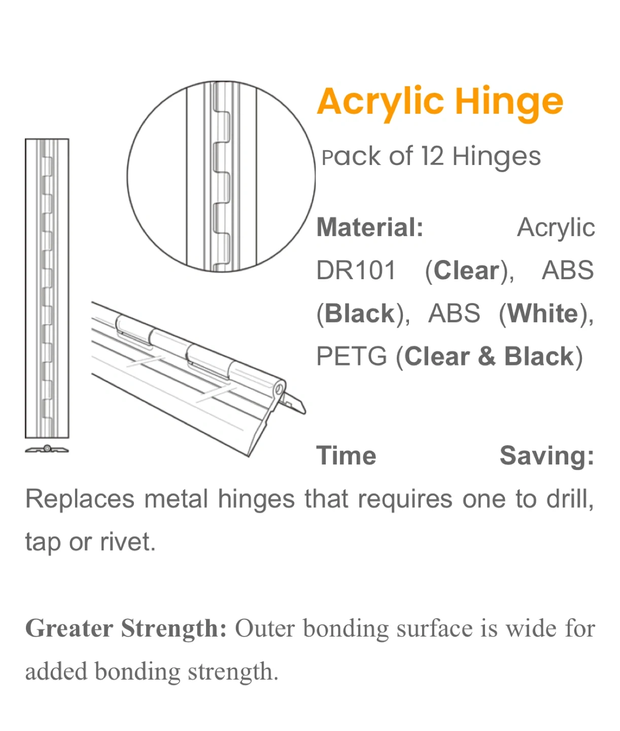 Approx. 700 total 12" clear acrylic (PETG) piano hinges