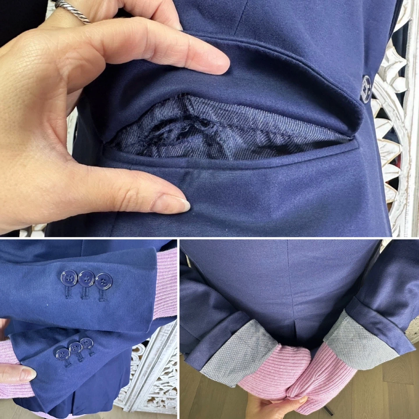 Pre-owned and in good condition. Relatively clean with signs of normal wear—no odors, stains, or fabric flaws. There is some darkening along the inside edge of the collar and on the folds of the cuffs. The lining inside one pocket is ripped, and there's a small white dot on the bottom of the left sleeve. I've worn the jacket a handful of times. You may want to dry clean or hand wash it with delicate detergent and air dry. I do this with all my dry-clean-only clothes and have never had an issue.