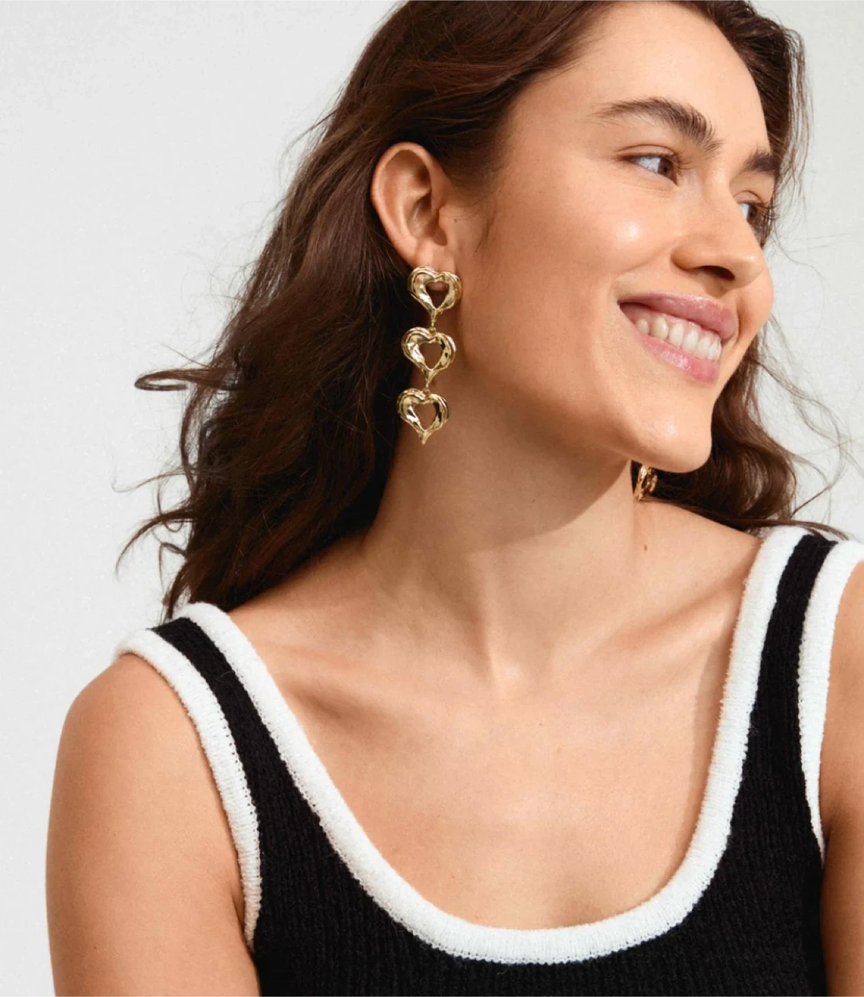 Fall in love with the latest trend—gold-plated earrings from Pilgrim's TIDE collection. Show off your style with our unique accessory featuring rows of organically shaped hearts. It’s a statement piece that exudes charisma and character! Pair these earrings with a breezy slip dress and a stack of layered bracelets to fully embrace summer's vibrant energy. Celebrate the season's most stunning accessories and make every moment shine! And guess what - they are made from 98% recycled material, - that's fashion with a conscience.