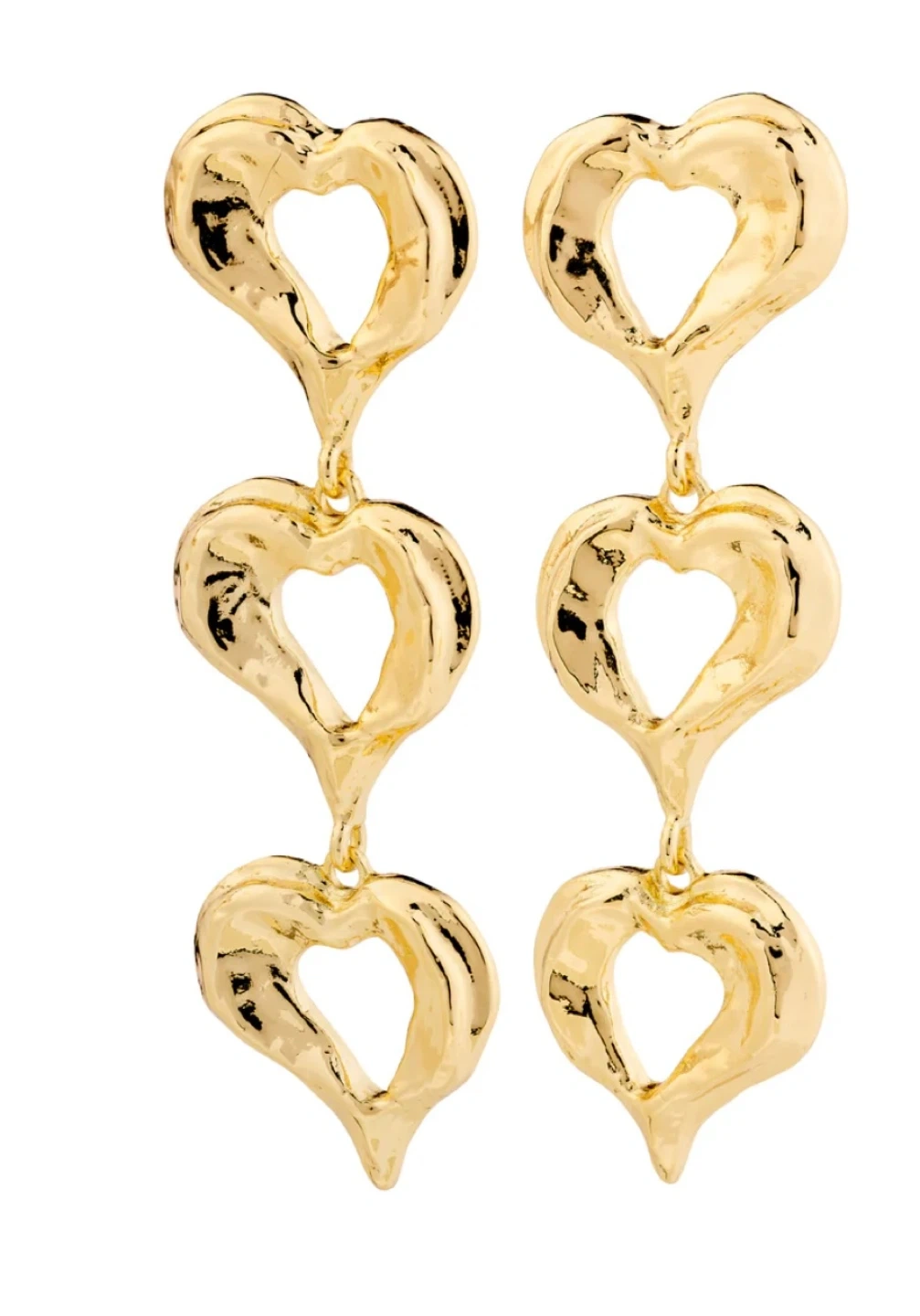 Fall in love with the latest trend—gold-plated earrings from Pilgrim's TIDE collection. Show off your style with our unique accessory featuring rows of organically shaped hearts. It’s a statement piece that exudes charisma and character! Pair these earrings with a breezy slip dress and a stack of layered bracelets to fully embrace summer's vibrant energy. Celebrate the season's most stunning accessories and make every moment shine! And guess what - they are made from 98% recycled material, - that's fashion with a conscience.