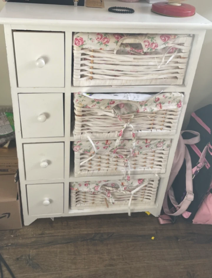 A cute little white cabinet with four drawers that are actually wicker baskets with a floral fabric lining! It's a great way to add some storage and a touch of cottage charm to any room