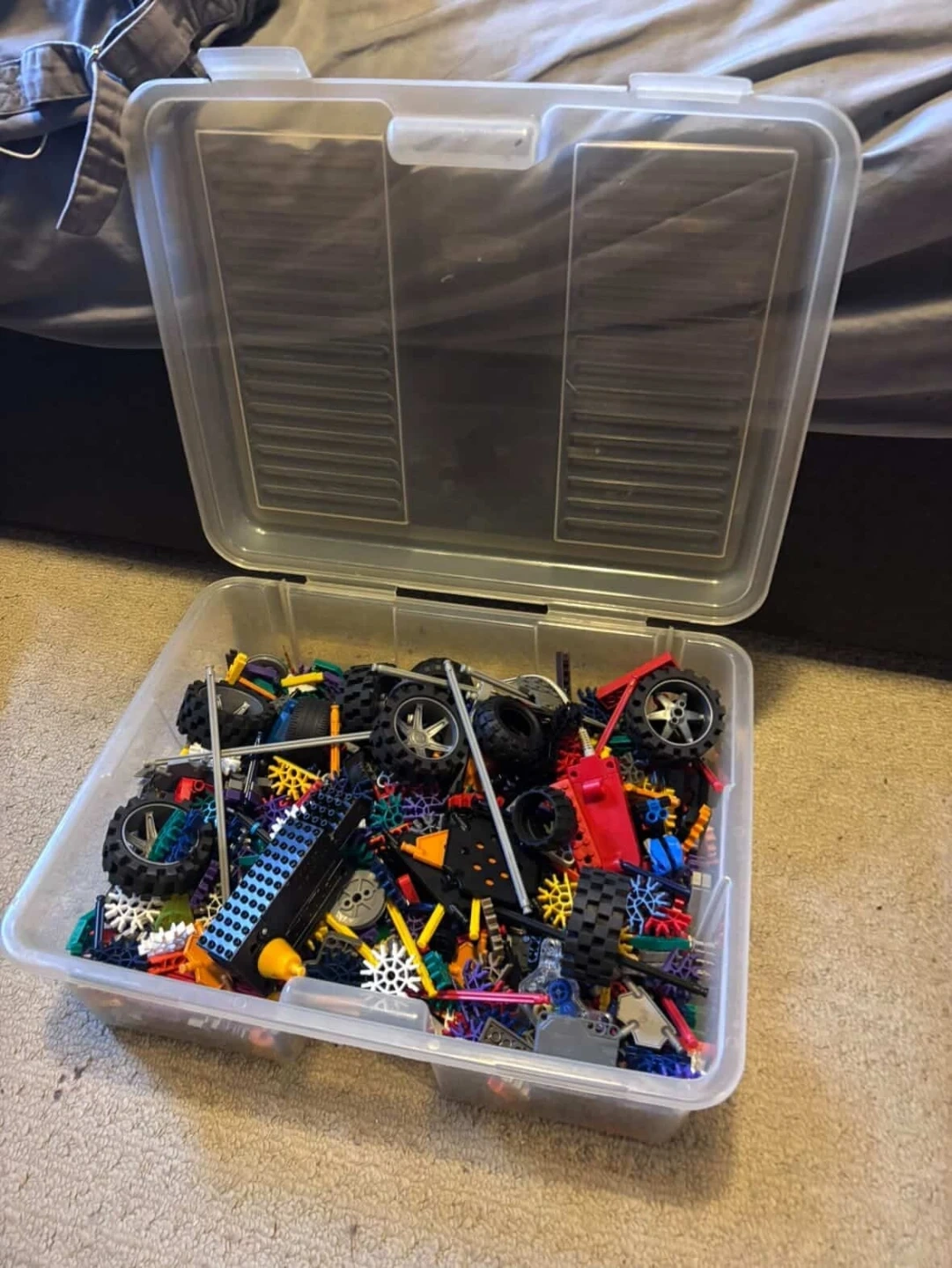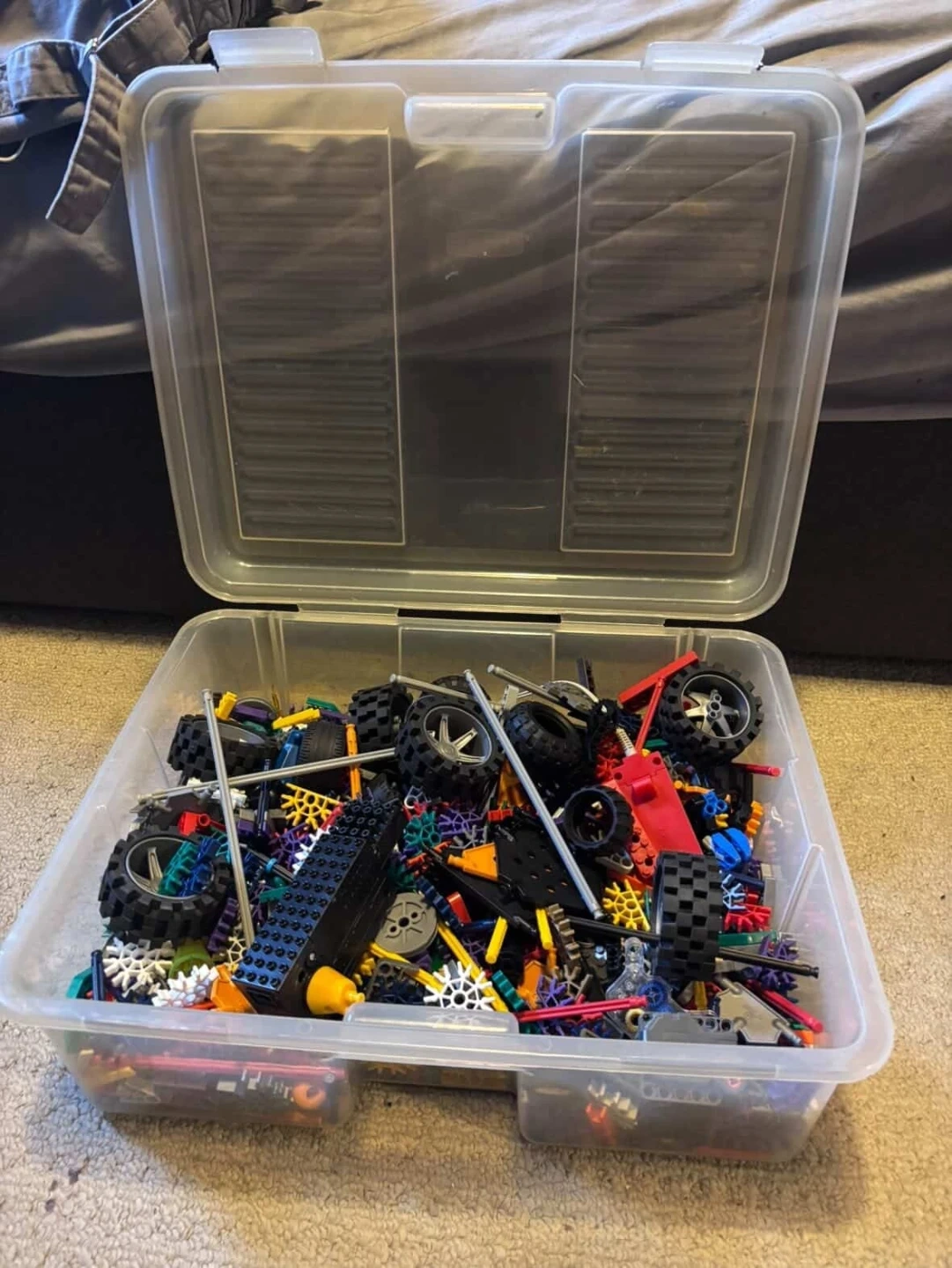 Large assortment of K'NEX building pieces in a clear storage bin. Includes various rods, connectors, wheels, and other accessories for building models. Great for creative construction projects!