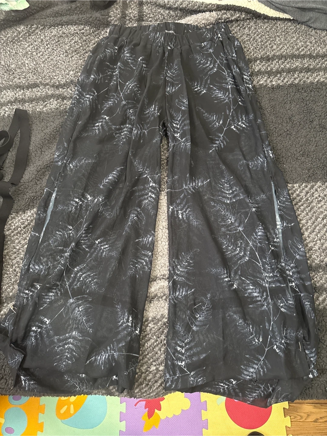 Very lightweight, flowy pants with blue fern print with built-in shorts. Pant legs have slits. Great for hot days, in great condition