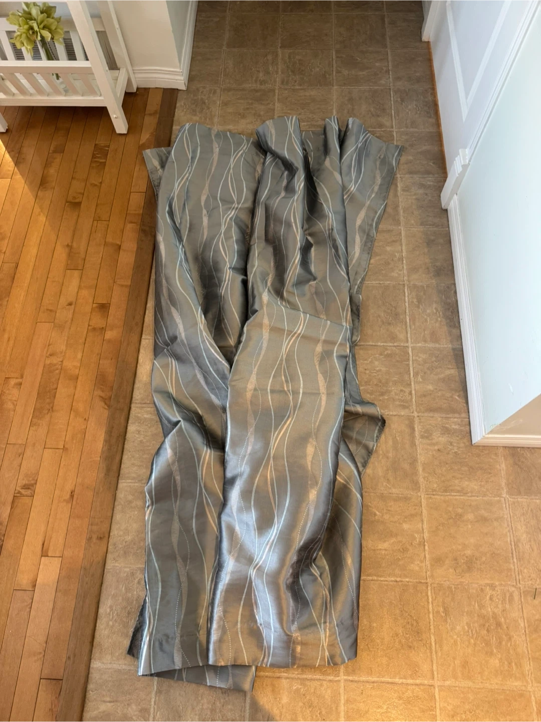 These are grey curtains with a modern wave pattern. They're made of a silky material that catches the light nicely. They'll add a touch of elegance to any room. Good for living rooms or bedrooms! Length is 72” long. They are a beautiful light blue with grey.