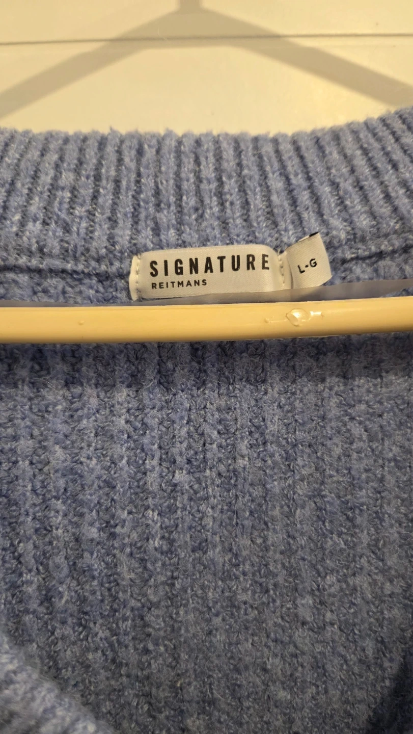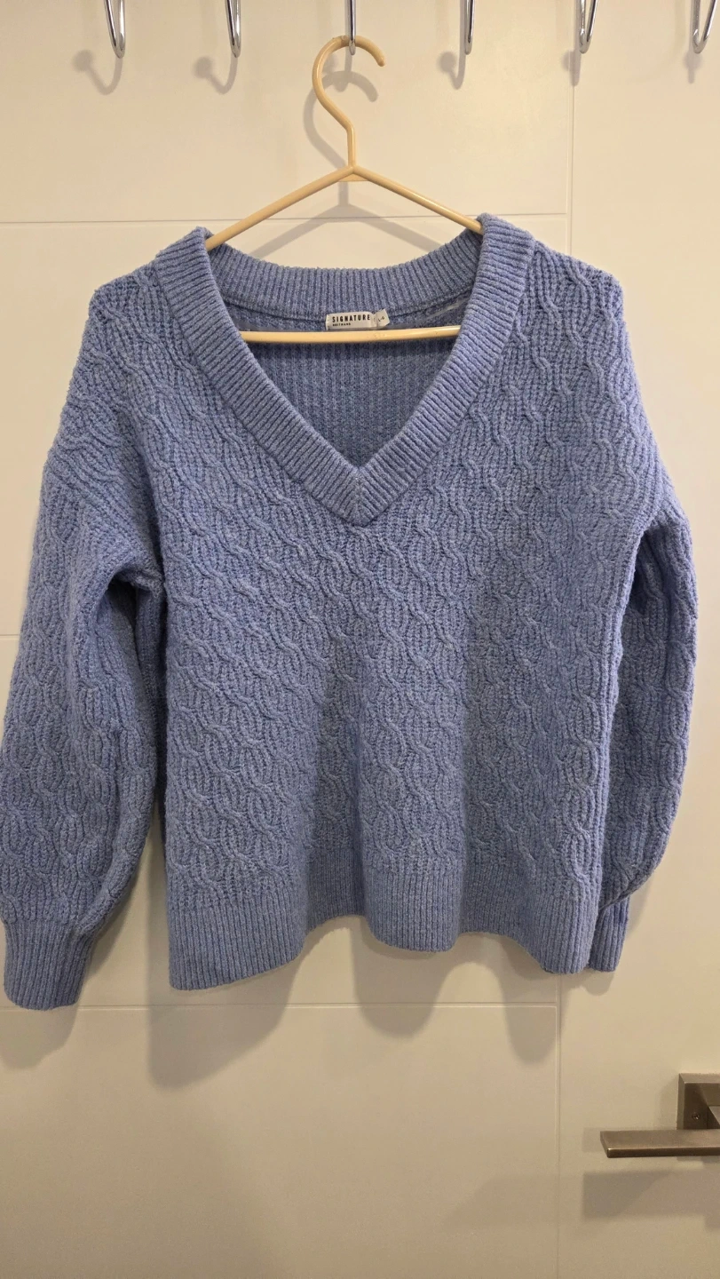 This Reitmans Signature sweater comes in a lovely periwinkle blue. It's a v-neck style with a textured knit pattern. Size is large.