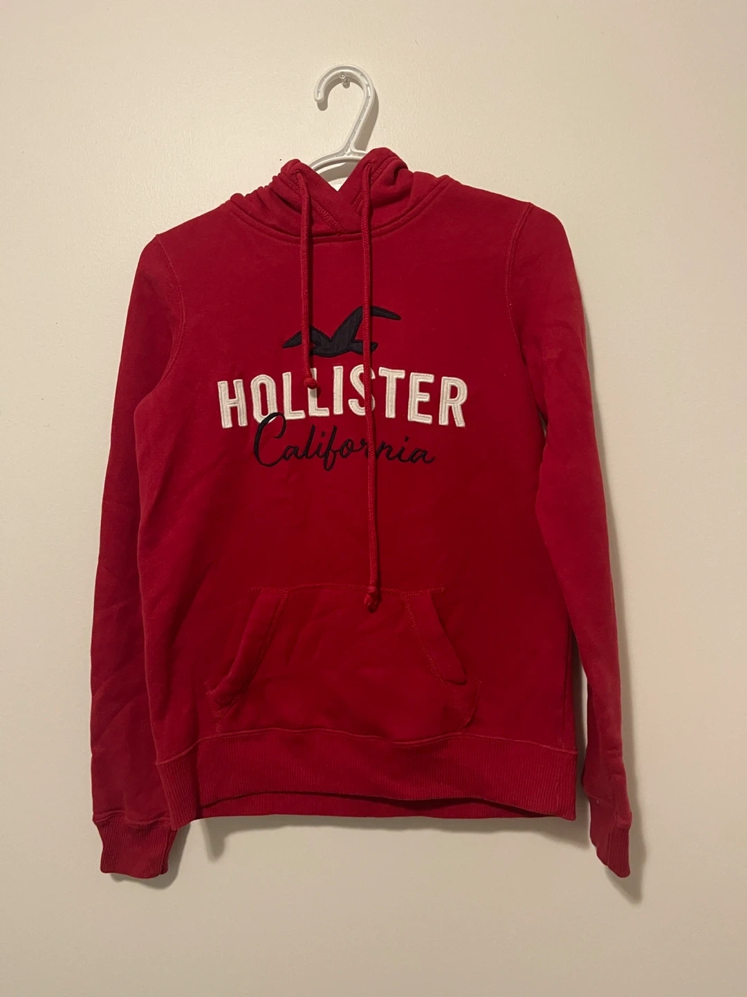 Selling a red Hollister California hoodie in size XS. It's in great condition and ready for a new owner! Perfect for layering or just staying cozy.