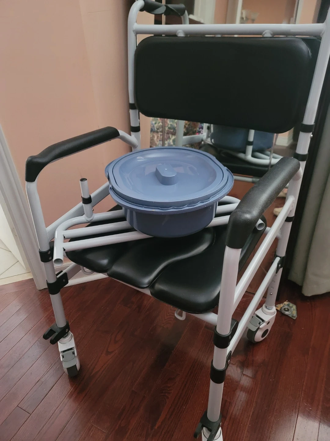 Selling a commode chair with wheels! Never used. Perfect for anyone needing a bit of extra assistance. The chair is sturdy and has a comfortable seat and backrest. Pail included, which mounting under chair.