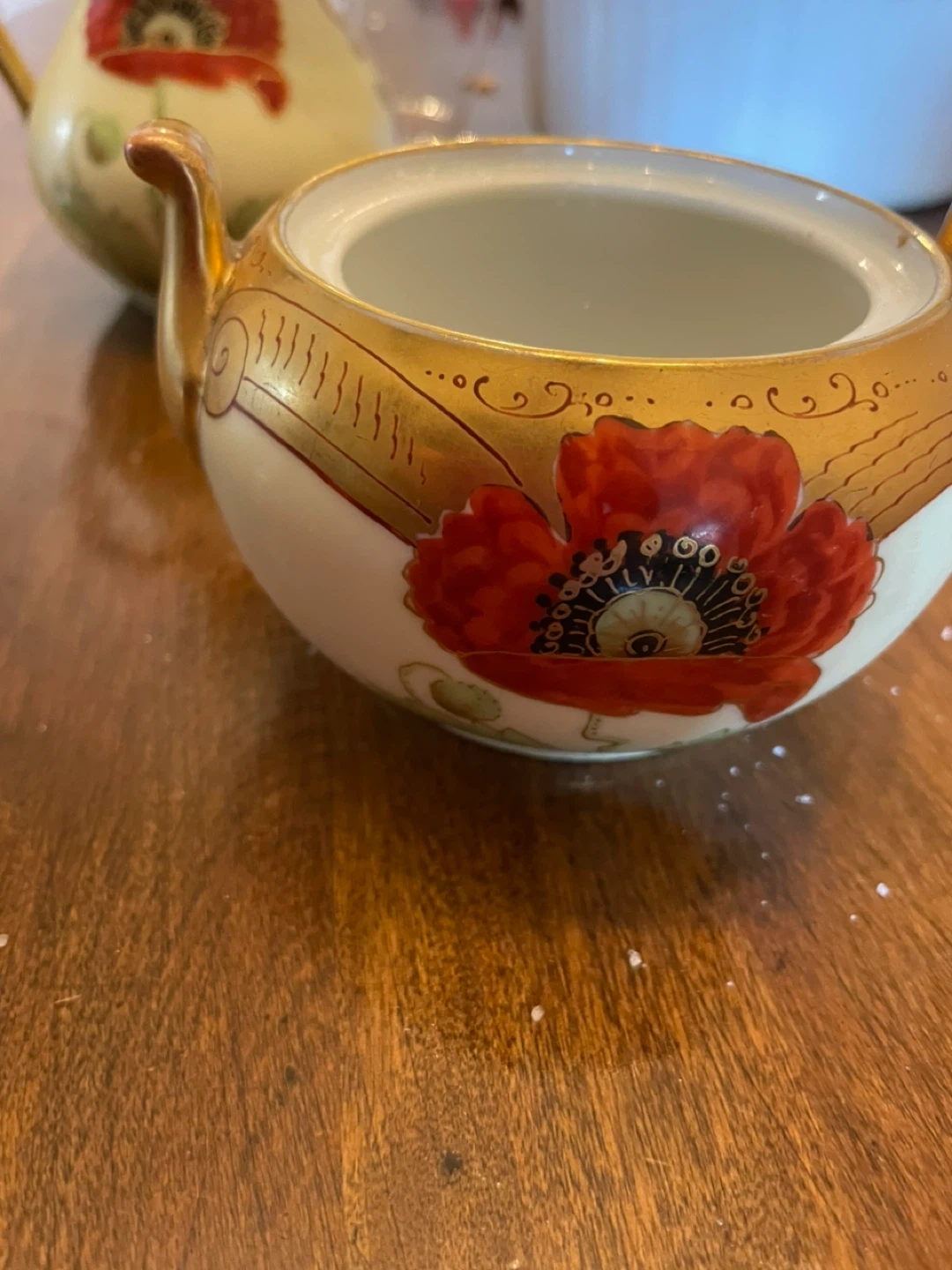 This is a delicate handpainted porcelain sugar bowl from Austria. It features a vibrant red poppy design with gold accents. The bowl has two small handles.