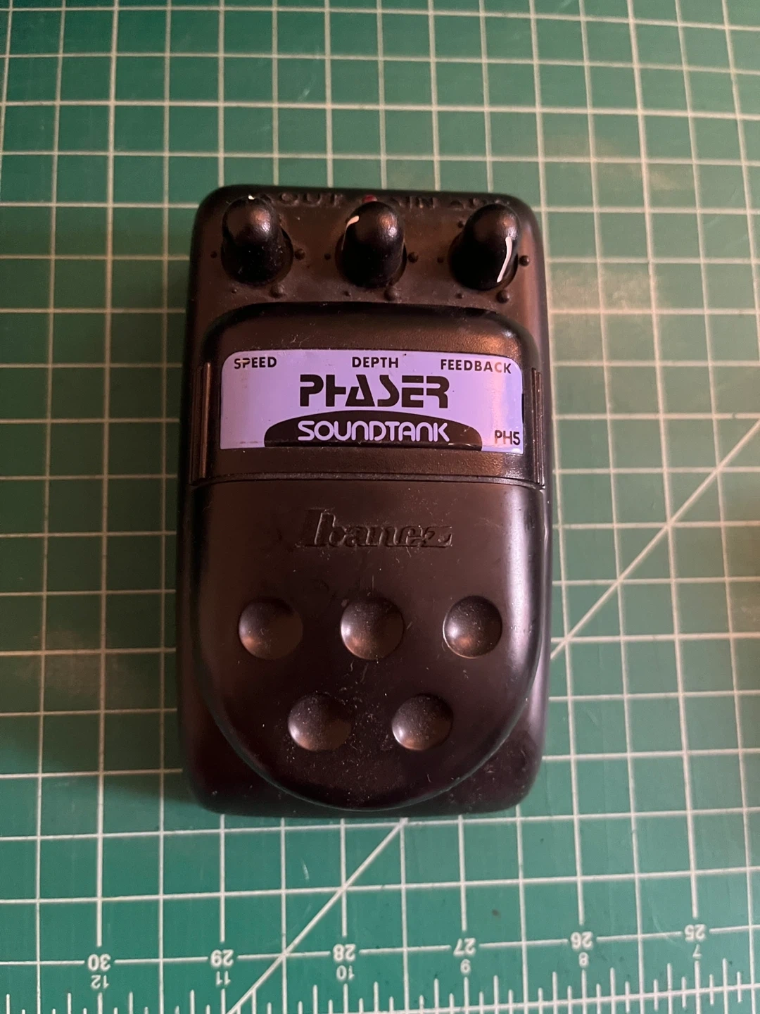 This is an Ibanez Soundtank PH5 phaser guitar pedal. It has controls for speed, depth, and feedback. Made in Taiwan.