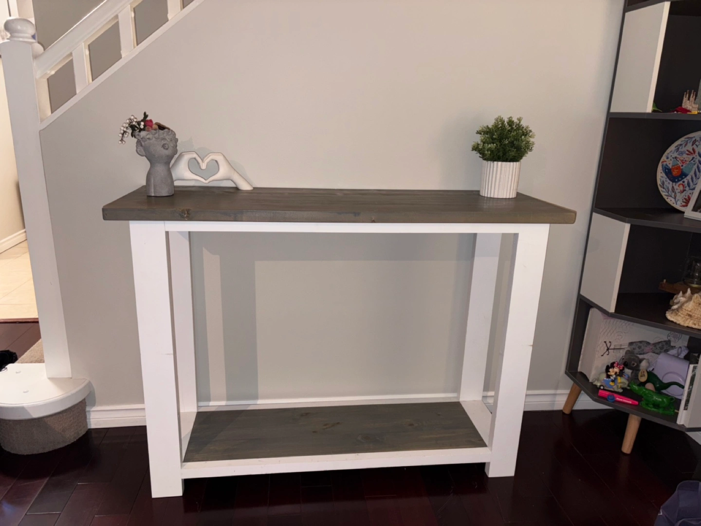 Handmade grey and white console table. Solid wood construction. Features a lower shelf. Great for entryway or living room.