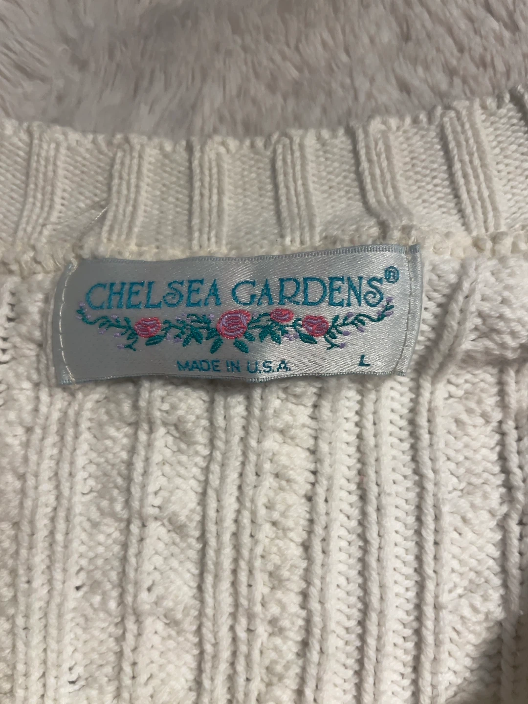 Vintage cream coloured cable knit sweater from Chelsea Gardens. Sz L and in good condition.