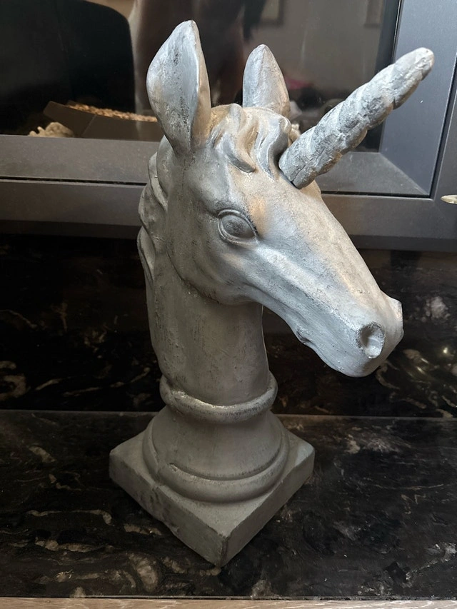 Add a touch of whimsy to your garden or home with this charming used unicorn statue. Material: plaster. Style: Garden, Home Decor. Theme: Unicorn. Condition: Used - Good. Cash accepted.